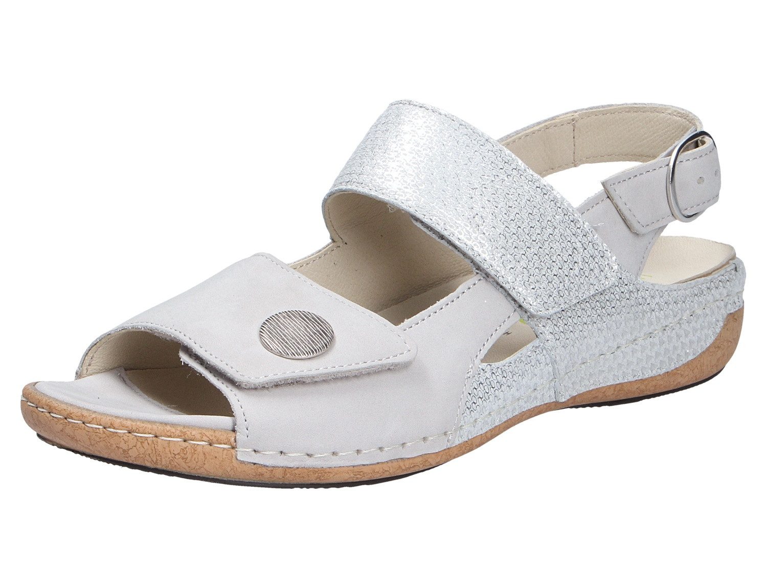 Bequeme Damensandale mit Comfort von Waldläufer aus einem feinen hochwertigem Nubukleder.Die angeraute Oberfläche ist besonders weich und gibt dem Leder ein angenehmes Gefühl. Ebenso glänzt das Modell durch eine weiche Lederausstattung. Die mit einem weichen Polster unterlegte lederbezogene Einlegesohle sorgt für ein angenehmes Fußklima, ist auswechselbar und somit für lose Einlagen geeignet. Auf diesen Schuh freuen sich besonders etwas breitere Füße:Die Weite H bietet hier ausreichend Platz. Der Absatz ist durchgehend flach ,die aus einem weichen PU-Material bestehende Laufsohle schont die Gelenke und federt jeden Tritt optimal ab. Klettverschlüsse halten den Schuh sicher am Fuß und sorgen auch für die individuelle und optimale Anpassung. Die Размер обуви fällt regulär aus.