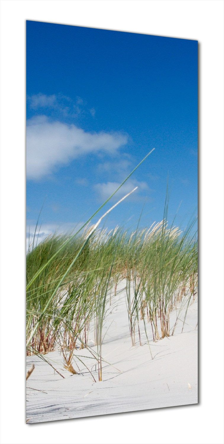 Traumhafter weißer Sand eine frische Brise weht durch das grüne Dünengras und im Hintergrund ein strahlend blauer Himmel mit einer einzigen Wolke. So sieht der perfekte Tag am Strand aus.