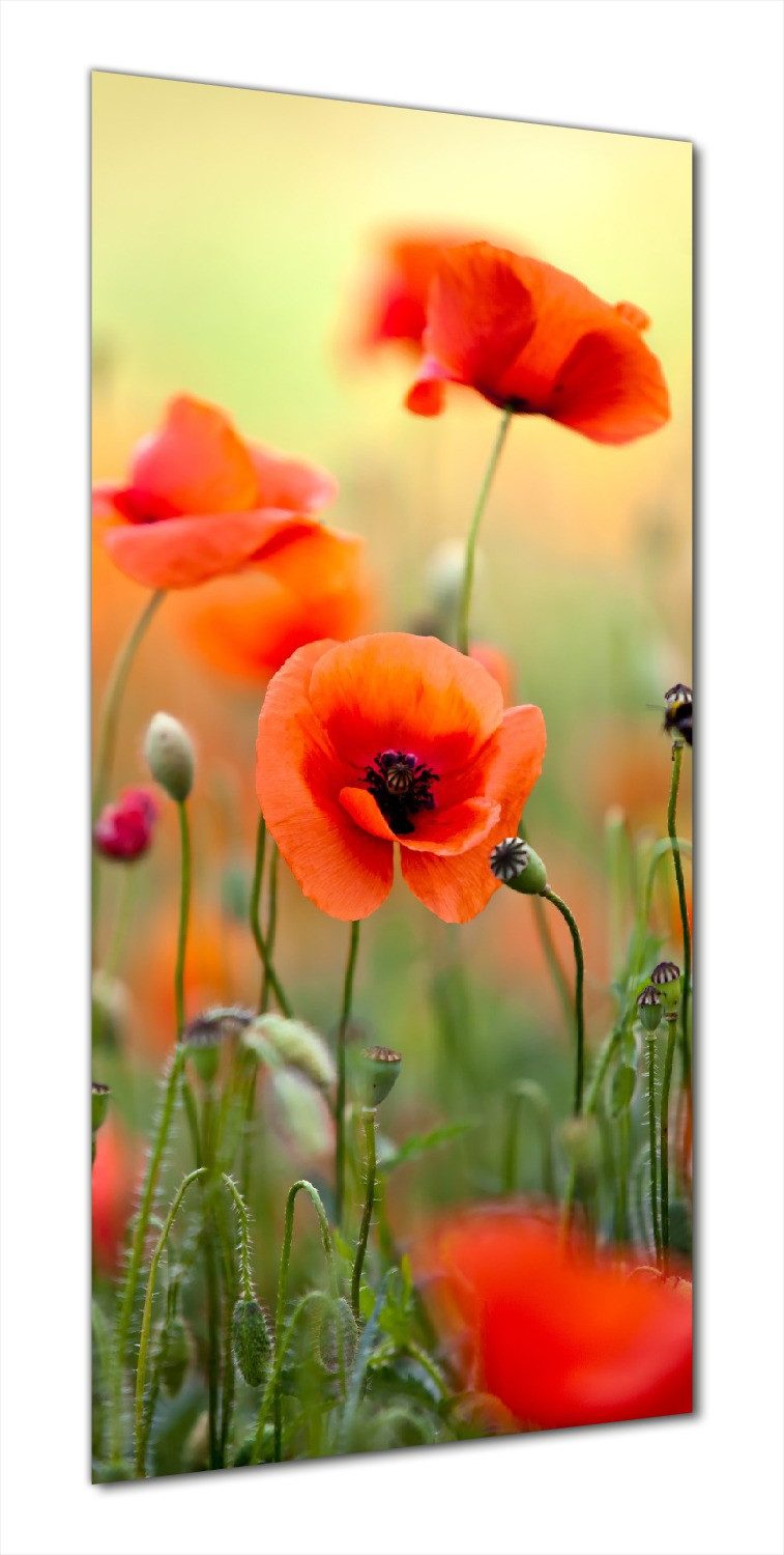Eine Nahaufnahme von Mohnblumen und Knospen auf einem Feld im dämmrigen Sonnenlicht welches die rote Farbe der Blumen schön zur Geltung bringt.