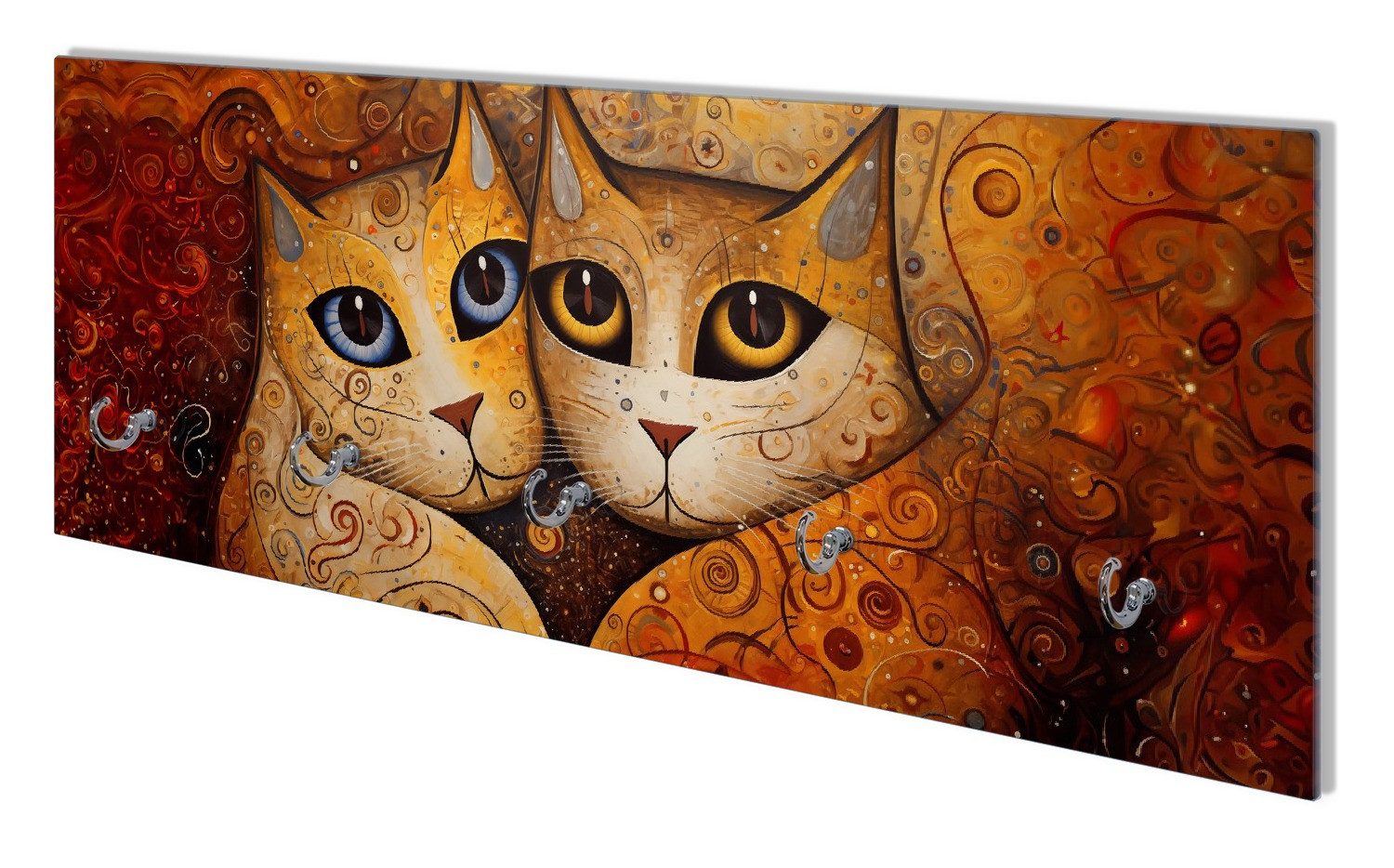 Das Bild zeigt ein fesselndes Doppelporträt von Katzen mit tiefen, ausdrucksstarken Augen, umgeben von einem Wirbel goldener und erdiger Ornamente, die eine warme und einladende Atmosphäre schaffen. Die Verschmelzung von Realismus und Abstraktion in diesem Werk fängt den Blick des Betrachters und lässt Raum für Interpretation.