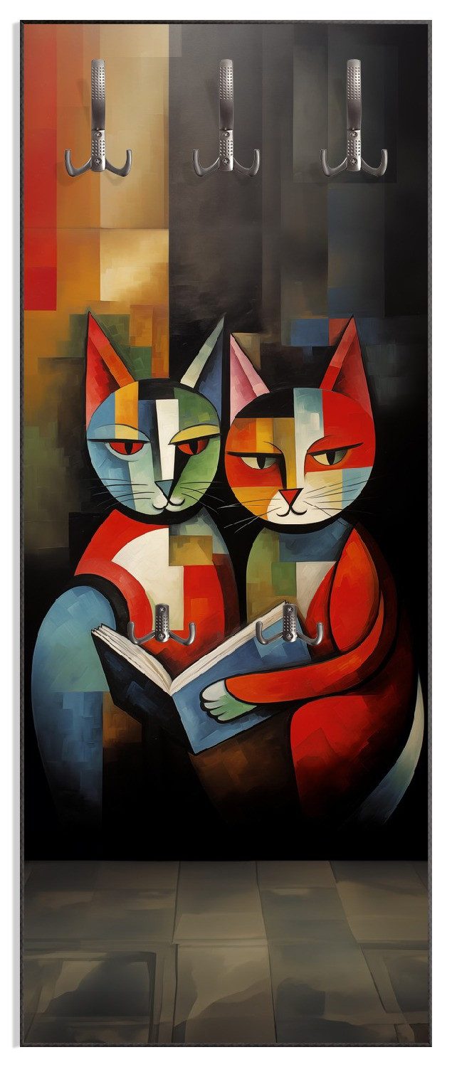 Zwei katzenartige Figuren, kunstvoll in einem kubistischen Stil gemalt, teilen einen intimen Moment der Stille beim Lesen eines Buches. Die reichen, blockartigen Farben verleihen der Szene eine beruhigende Atmosphäre, während die geometrischen Formen und Muster das Interesse und die Neugier der Tiere widerspiegeln.