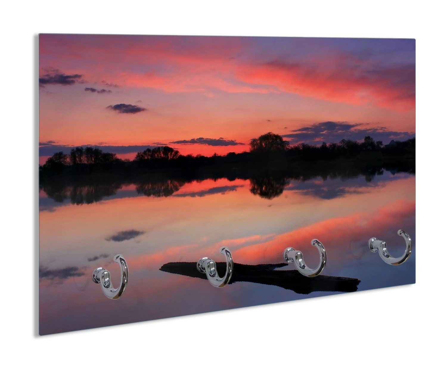 Die untergehende Sonne taucht den leicht bewölkten Abendhimmel in ein atemberaubendes Farbspiel aus rotem und blauem Licht, vor dem sich das mit Bäumen bewachsene Ufer nur noch als schwarze Silhouette abhebt.