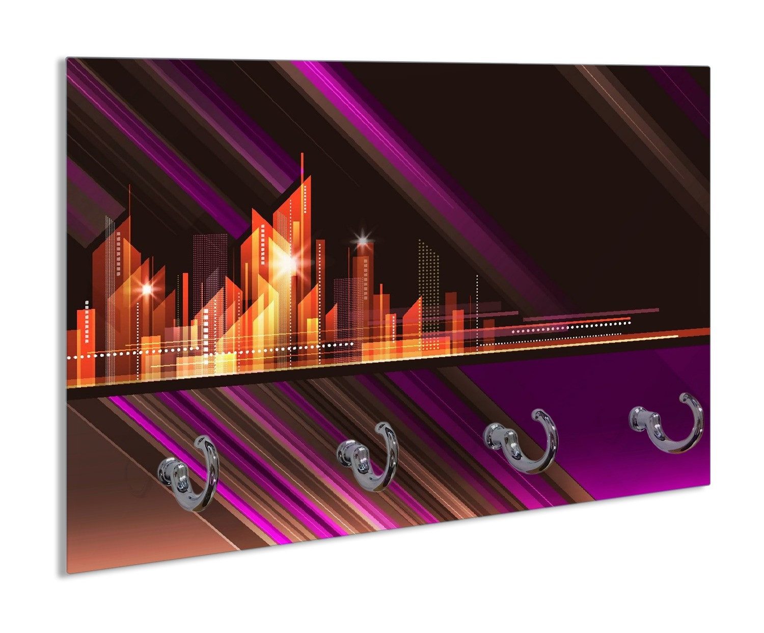 In den stilisierten Silhouetten einer modernen Stadt kann man diverse Hochhäusern in abendlicher Beleuchtung erkennen. Diese erheben sich vor einem lila und schwarz gestreiftem Hintergrund in den Himmel.
