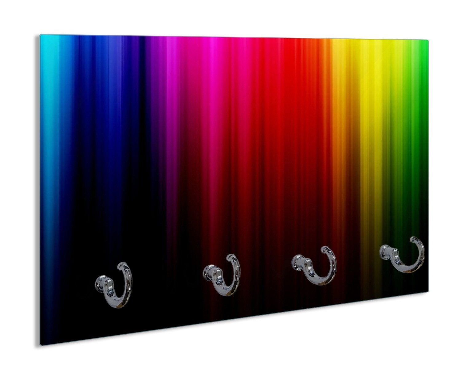 Tolle Regenbogenfarben, von blau über lila, pink, rot gelb bis grün, erstrecken sich hier wie ein farbenfroher Regenfall von oben nach unten. Im unteren Bereich verschwimmen die Streifen mehr und mehr mit dem schwarzen Hintergrund.