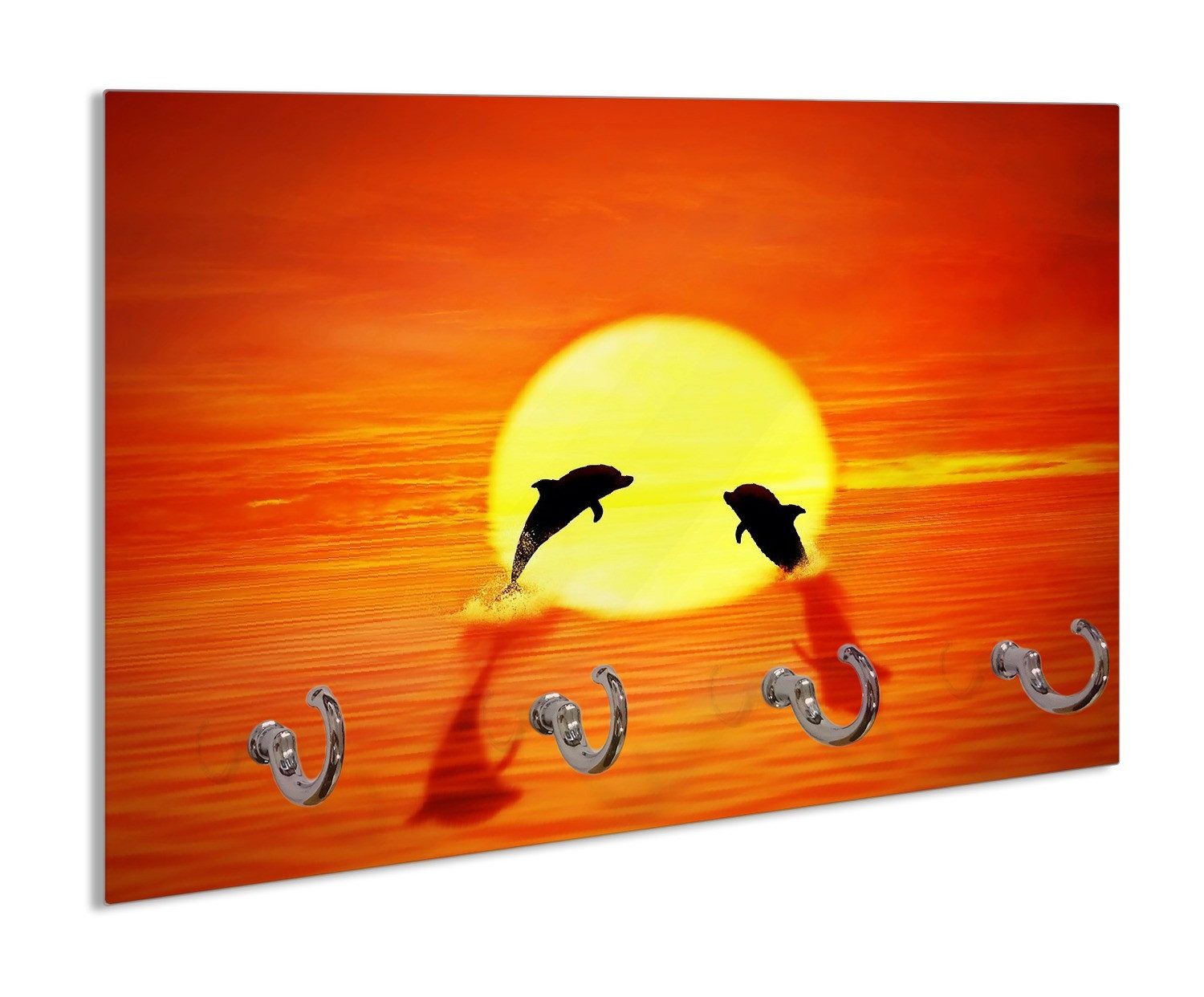 Zwei Delphine springen fröhlich aus dem durch die untergehende Sonne orange leuchtendem Meer. Im Hintergrund ein Sonnenuntergang in rot und orange. Die Delphine sind in Kontur zu erkennen.