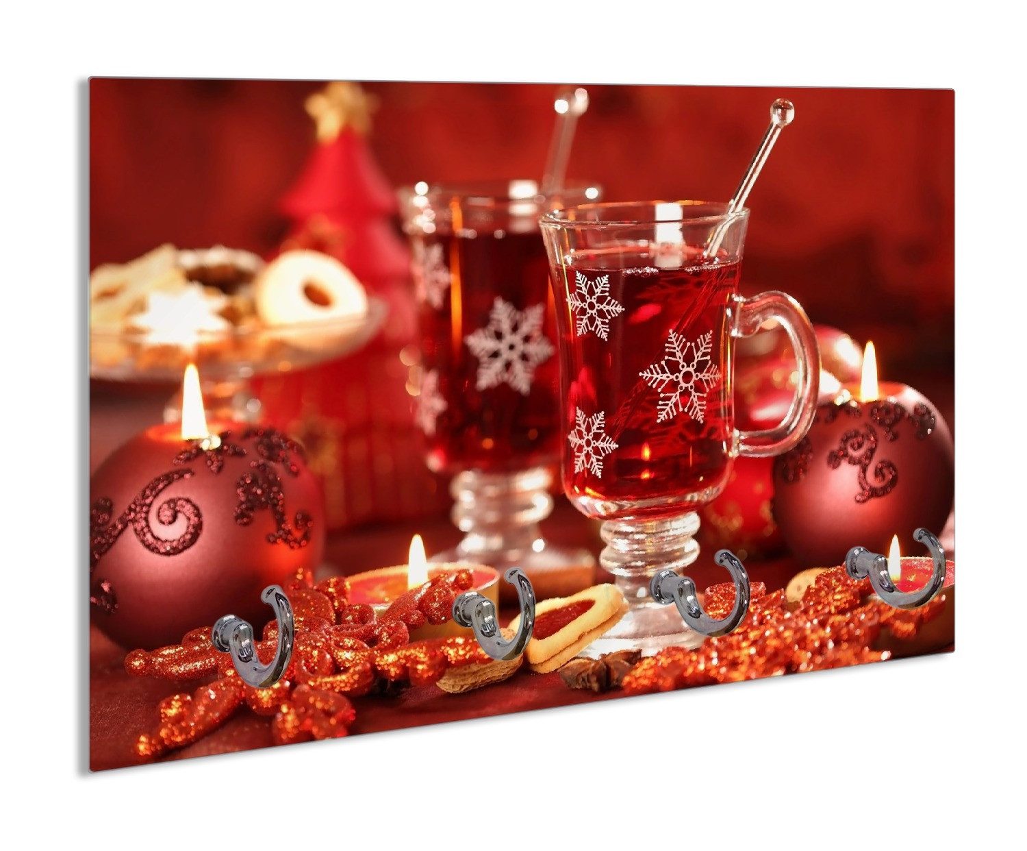 Ein köstlicher heißer Winterpunsch mit Gebäck wird von Kerzen und dekorativen roten Schneekristallen umgeben. Gemütlichkeit und Geborgenheit bei Kerzenscheim, perfekt für einen romantischen Abend vor dem Kamin.