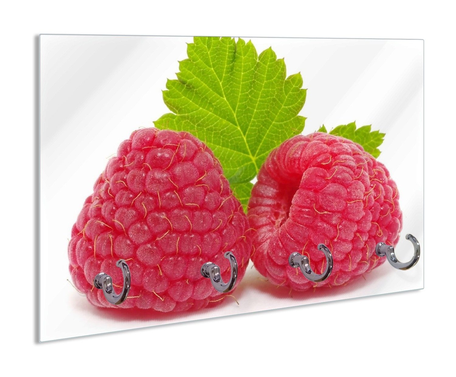 Zwei reife Himbeeren mit grünem Blatt vor weißem Hintergrund. Schönes Motiv für die Küche.