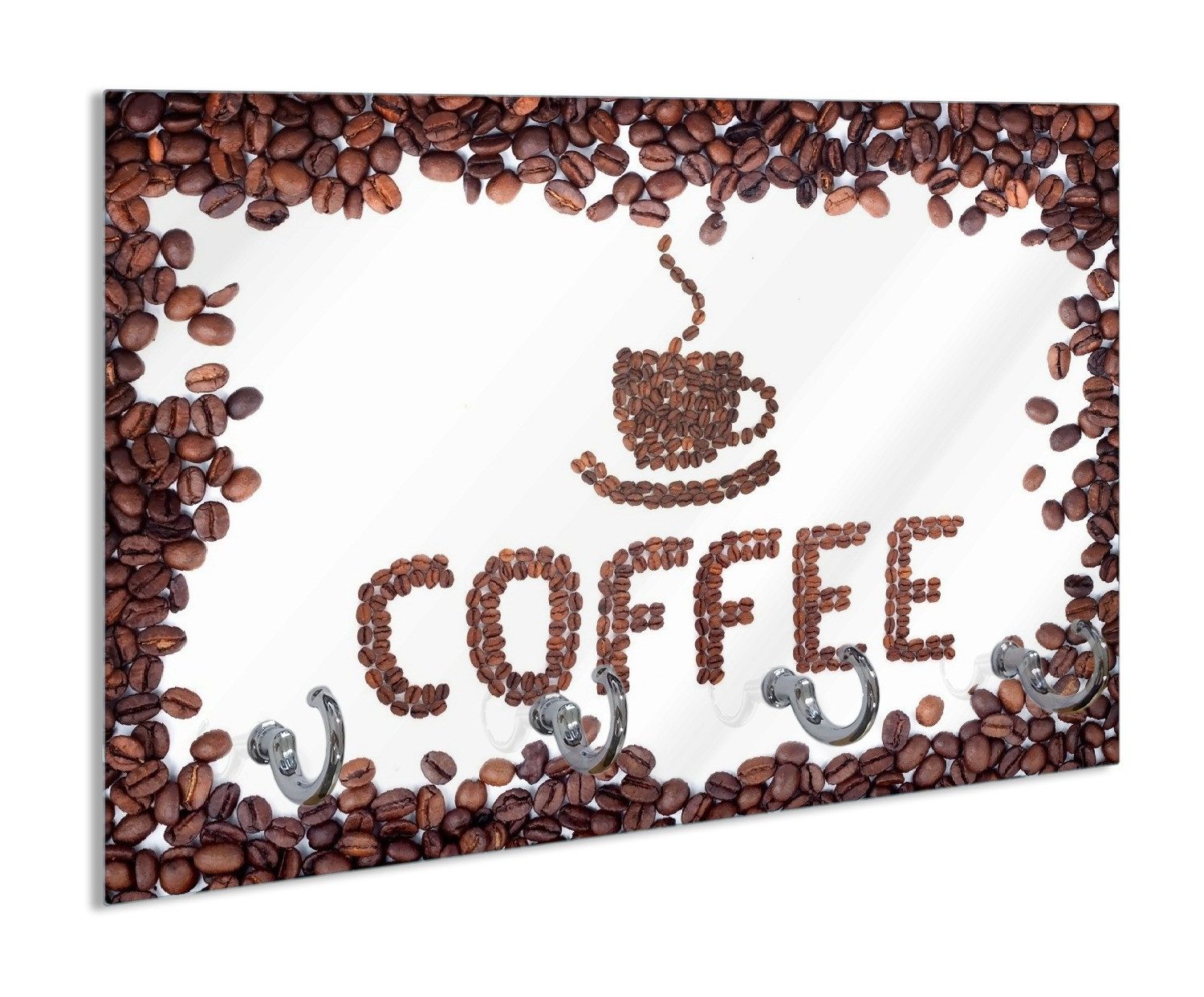 Frisch geröstete Kaffeebohnen ergeben den Schriftzug COFFEE vor einem weißen Hintergrund. Die Bohnen sind braun und um den Schriftzug und die Kaffeetasse angeordnet. Ein schönes Motiv für die Küche.