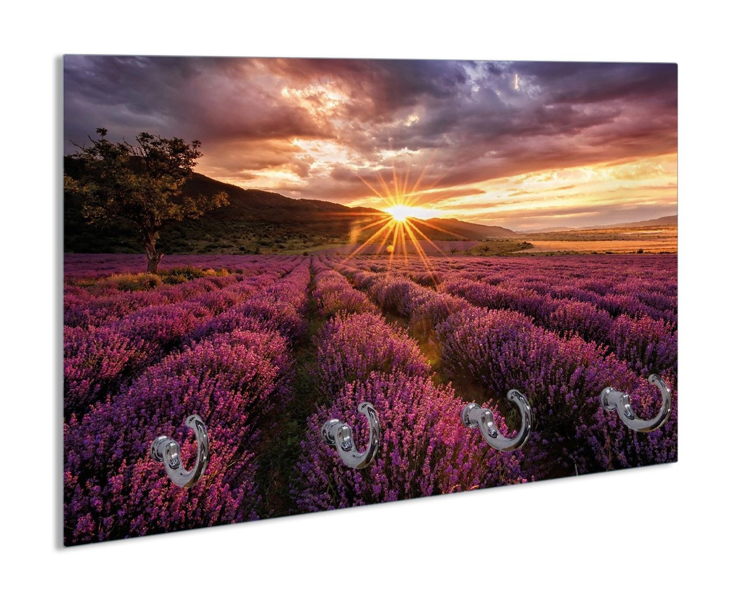 Wallario Handtuchhalter Lavendelfeld bei Sonnenuntergang - Sonnenstrahlen, aus Glas mit 4 Metallhaken