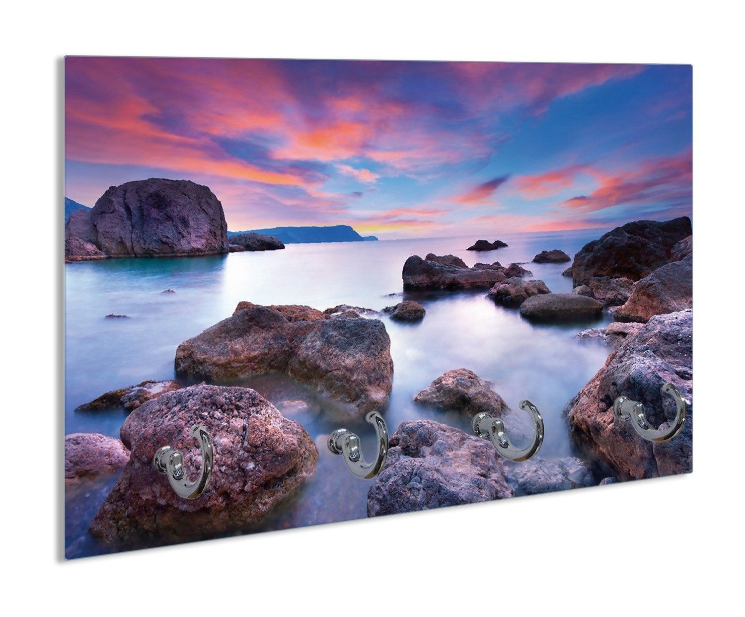 Wallario Handtuchhalter Seelandschaft in blau und rot mit großen Felsen, aus Glas mit 4 Metallhaken