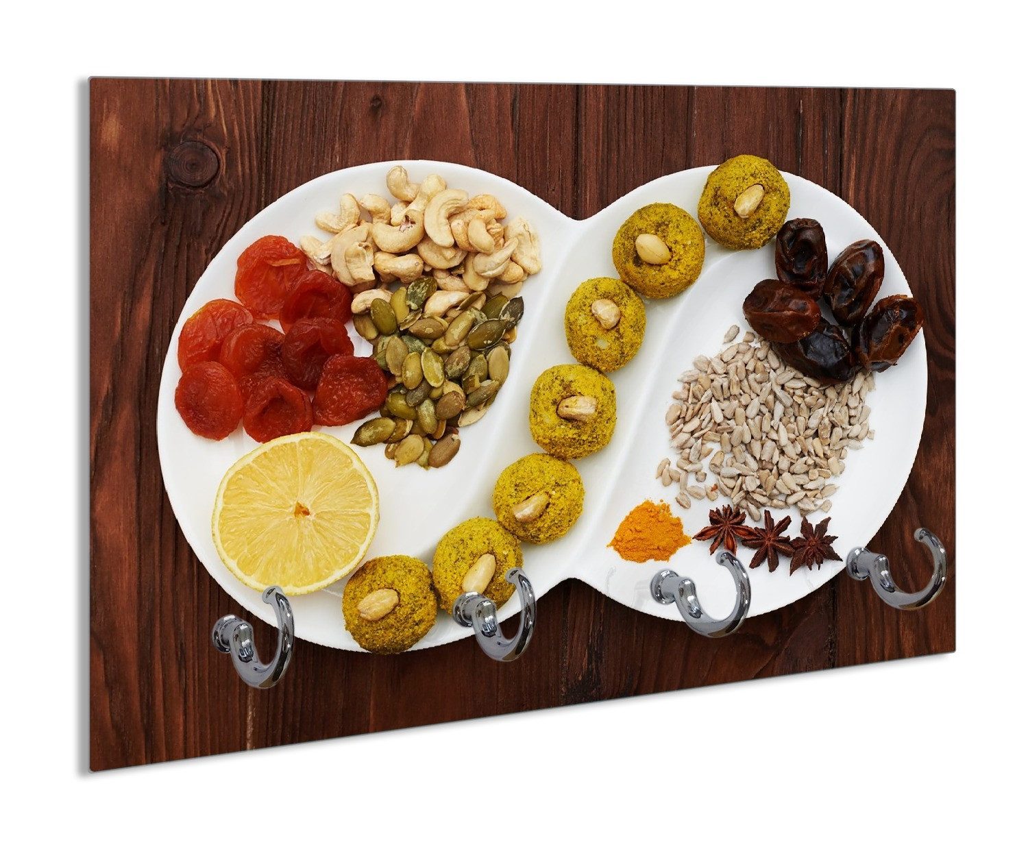 Verschiedene Trockenfrüchte, Nüsse und Kerne sind liebevoll auf einem Teller arrangiert. Der weiße Teller befindet sich auf dunklem Holz.
