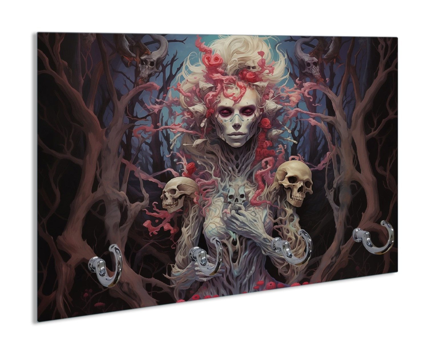 Eine geisterhafte Gestalt erhebt sich aus einem Wald der Schatten, ihr Körper verwoben mit knorrigen Ästen und roten Blüten, umgeben von Schädeln, wie stumme Zeugen der Vergänglichkeit. Das Bild verströmt eine dunkle, mystische Schönheit und zieht den Betrachter in die Tiefen einer uralten Legende.