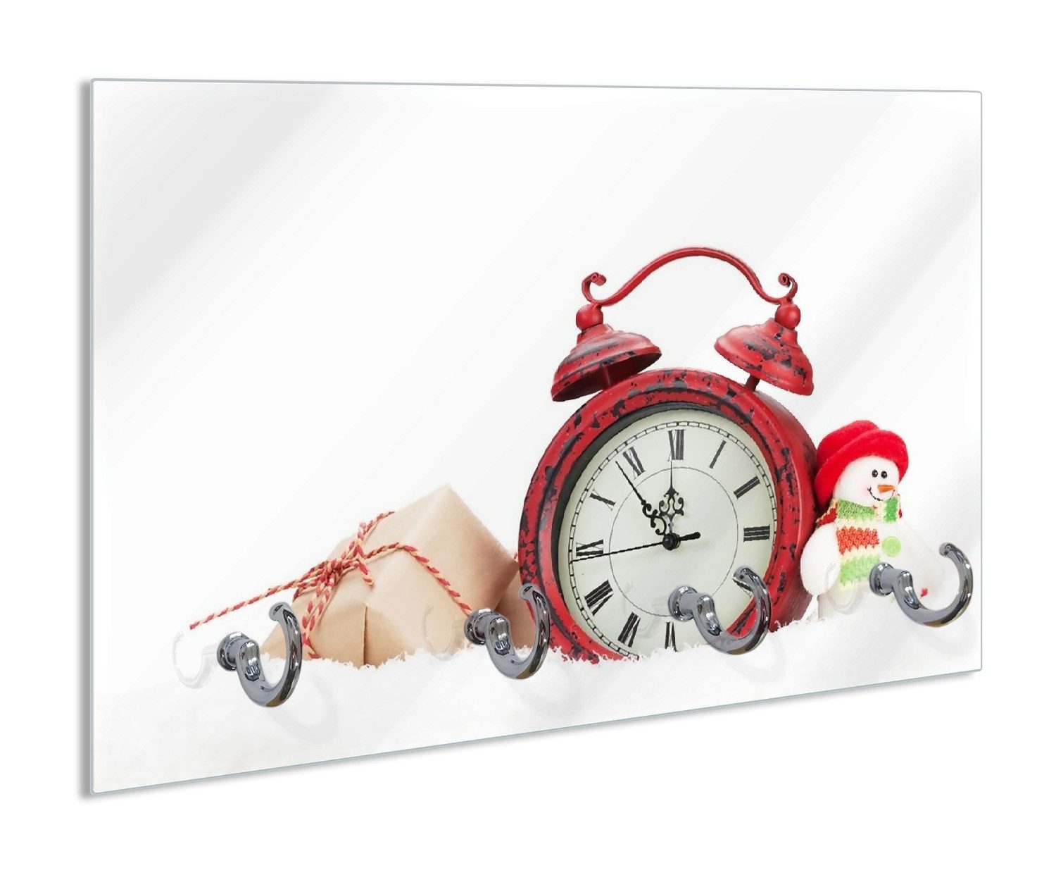 Ein alter, roter Wecker, der kurz vor 12 anzeigt. Ein passendes Motiv zu Weihnachten bzw. Neujahr. Neben der Uhr steht ein Geschenk und ein kleiner süßer Schneemann mit roter Mütze und grün-rotem Schal.