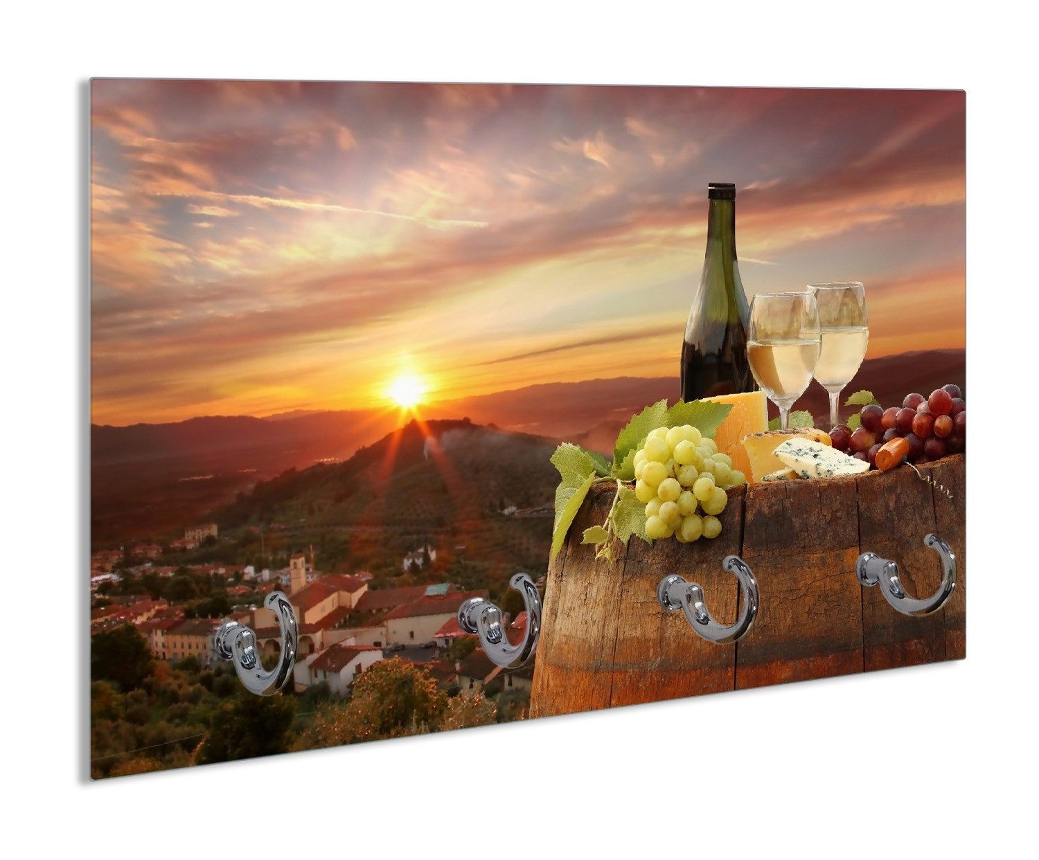 Ein Blick über die berühmte Weinanbauregion Chianti in der Toskana bei Abenddämmerung. Im Vordergrund steht ein altes Weinfass mit Trauben und zwei Gläsern Wein.