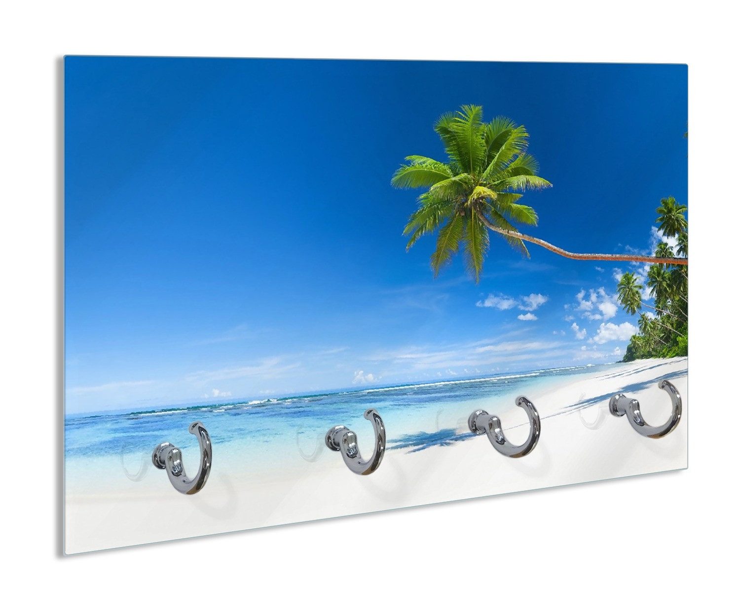 Wallario Handtuchhalter Weißer Sandstrand am Meer - Ein Traum unter Palmen, aus Glas mit 4 Metallhaken