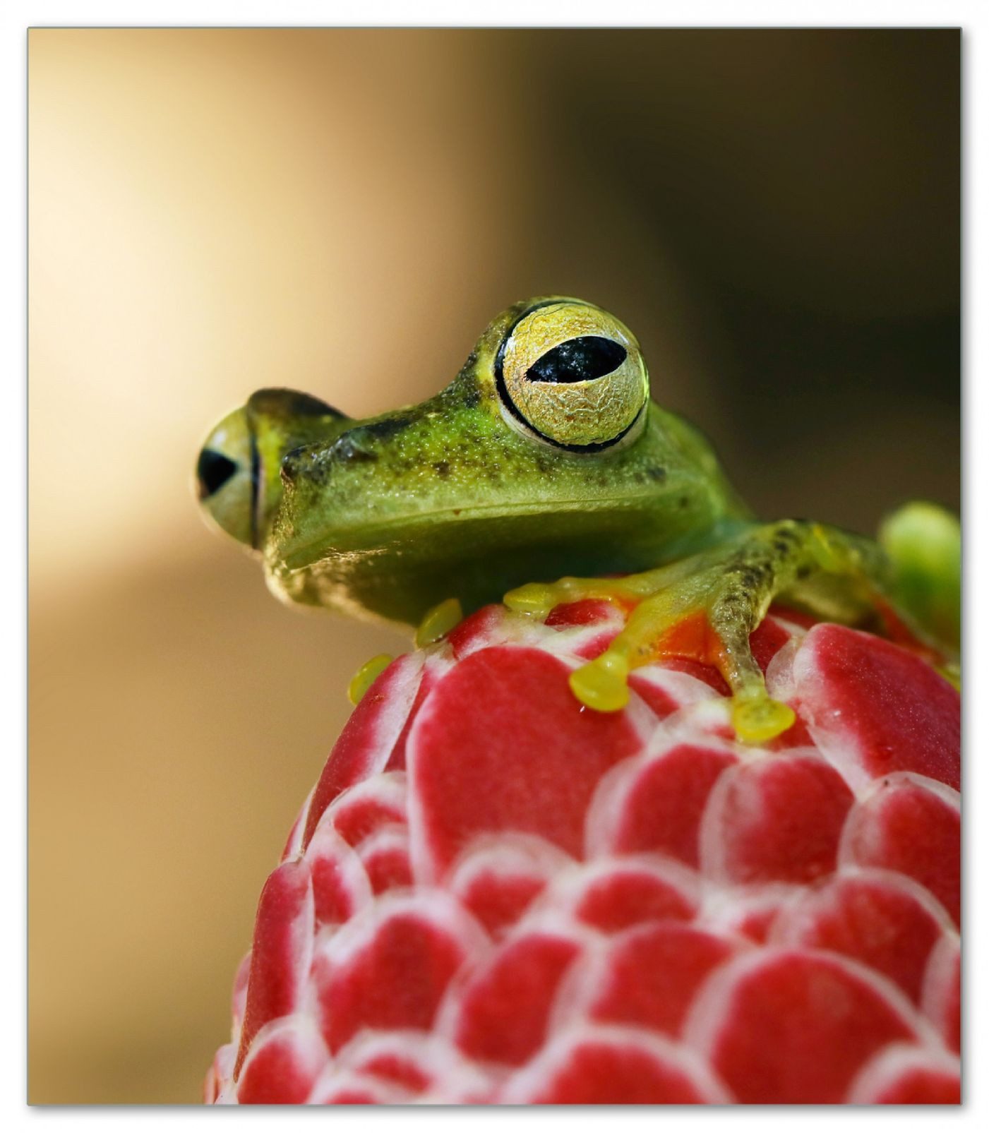 Ein neugieriger Laubfrosch thront auf dem Gipfel einer exotischen Blüte, seine großen, ausdrucksstarken Augen scannen die Umgebung. Die Textur seiner Haut harmoniert mit den lebendigen Farben und Mustern der Pflanze, was eine natürliche Tarnung erzeugt. Die Nahaufnahme ermöglicht es, jedes Detail zu bewundern und schafft eine intime Verbindung zwischen Betrachter und Motiv, während der unscharfe Hintergrund den Fokus auf das faszinierende Wesen lenkt.