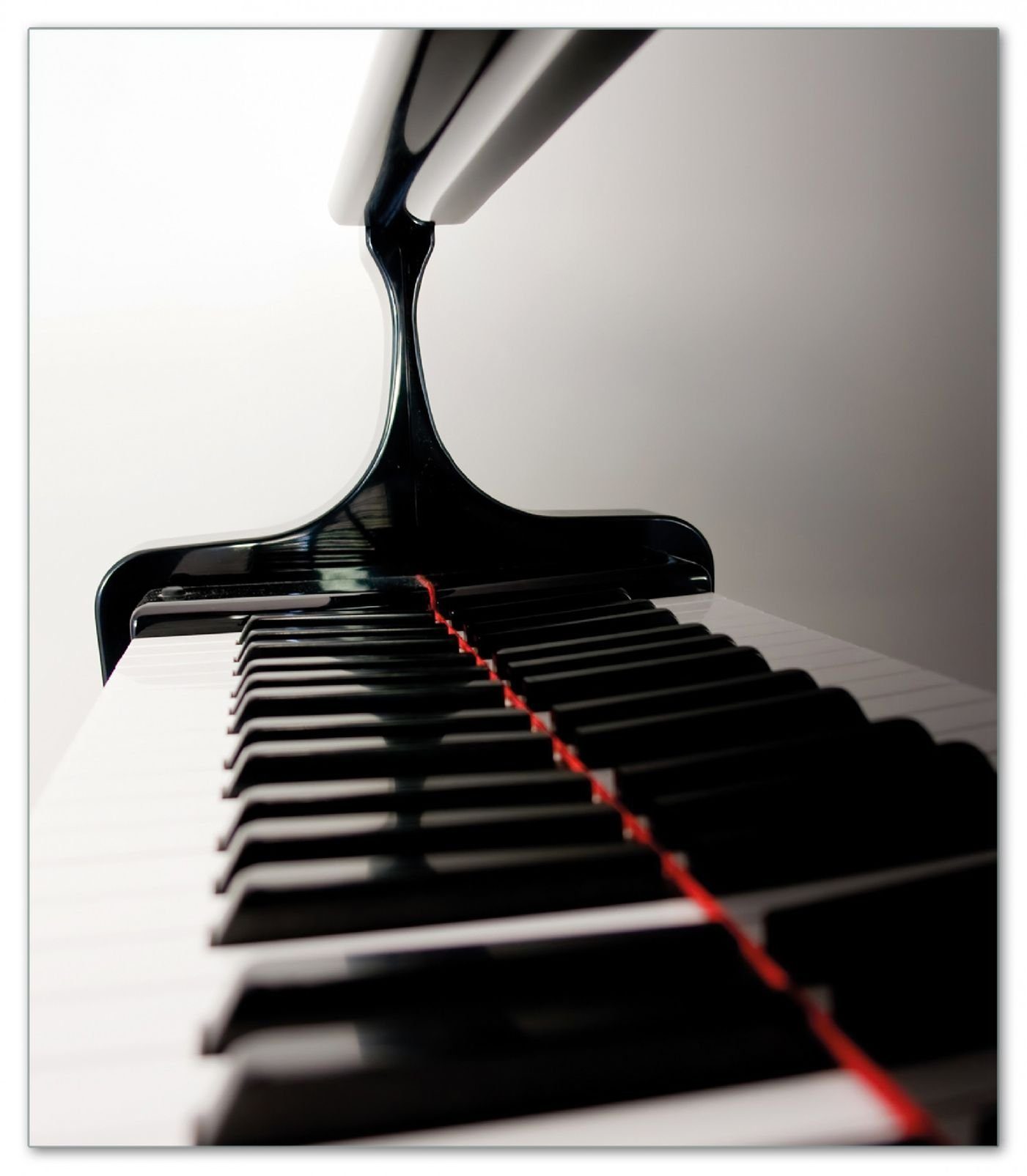 Tolle perspektivische Aufnahme einer glänzenden Klavier Tastatur. Das edle Schwarz / Weiß wird nur durch den roten Anschlagschutz durchbrochen und zusätzlich aufgewertet.