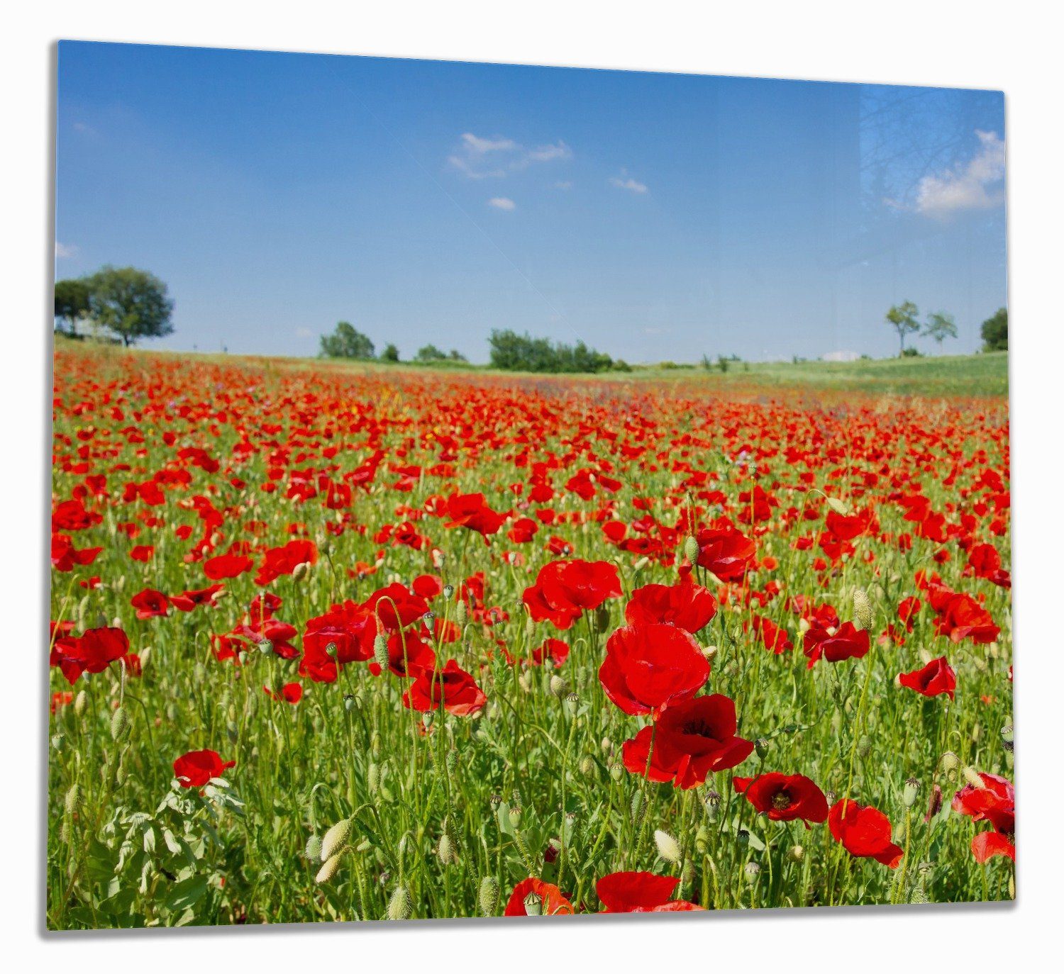 Wallario Herd-Abdeckplatte Mohnblumenfeld- rote Blumen unter blauem Himmel, ESG-Sicherheitsglas, (Glasplatte, 1 tlg., inkl. 5mm Noppen), verschiedene Größen