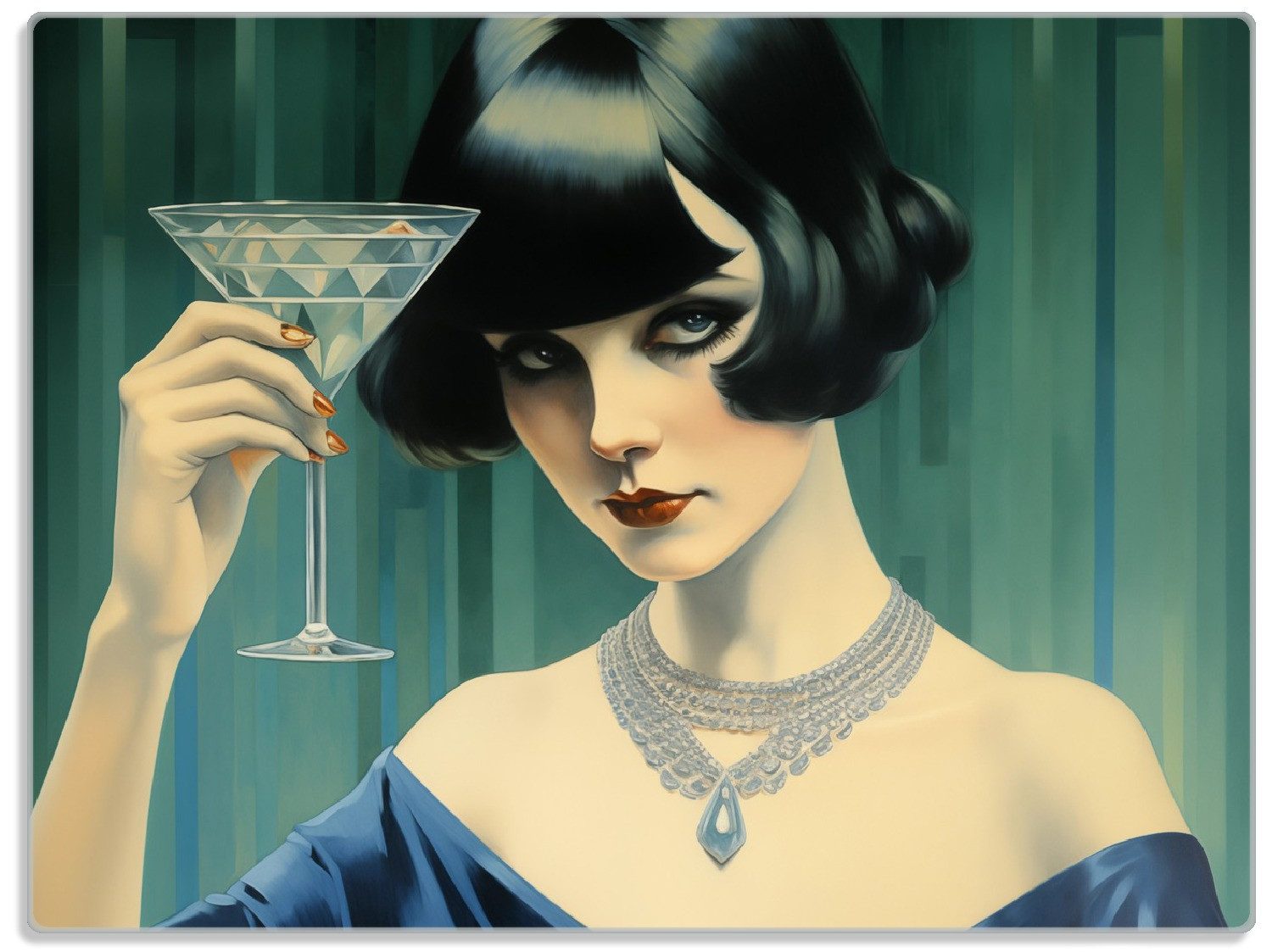 Eine Frau in zeitloser Eleganz, gekleidet in tiefes Blau und mit einer beeindruckenden Halskette, erhebt einen klassischen Martini. Ihr ausdrucksstarker Blick und die sorgfältig gestylten Haare reflektieren den unverwechselbaren Stil und die Faszination der Roaring Twenties. Das Bild zelebriert die anspruchsvolle Kultur der Cocktailstunden und die schillernde Ästhetik der damaligen High Society.