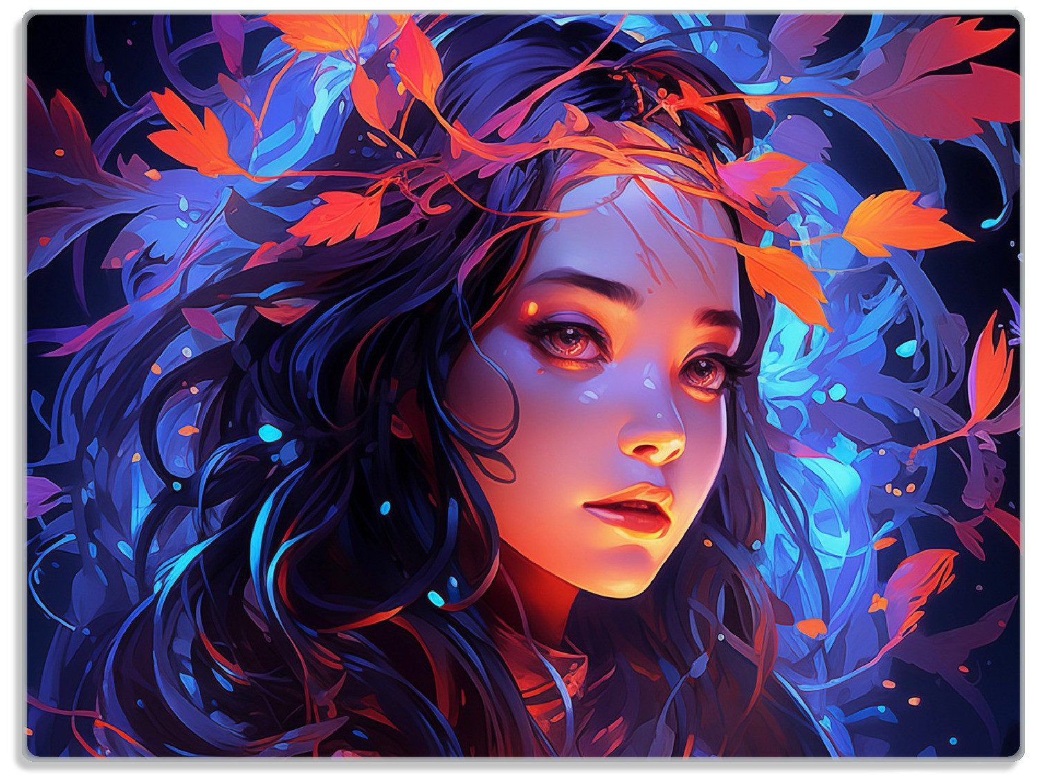 In einer faszinierenden Mischung aus warmen und kühlen Tönen, strahlt dieses Porträt eine magische Dualität aus. Die junge Frau ist umgeben von Blättern und Ranken. Ihr Haar und die Umgebung fließen in kräftigen Rot- und Blautönen, während ihr Blick die tiefe Verbindung zu den Elementen der Natur widerspiegelt.