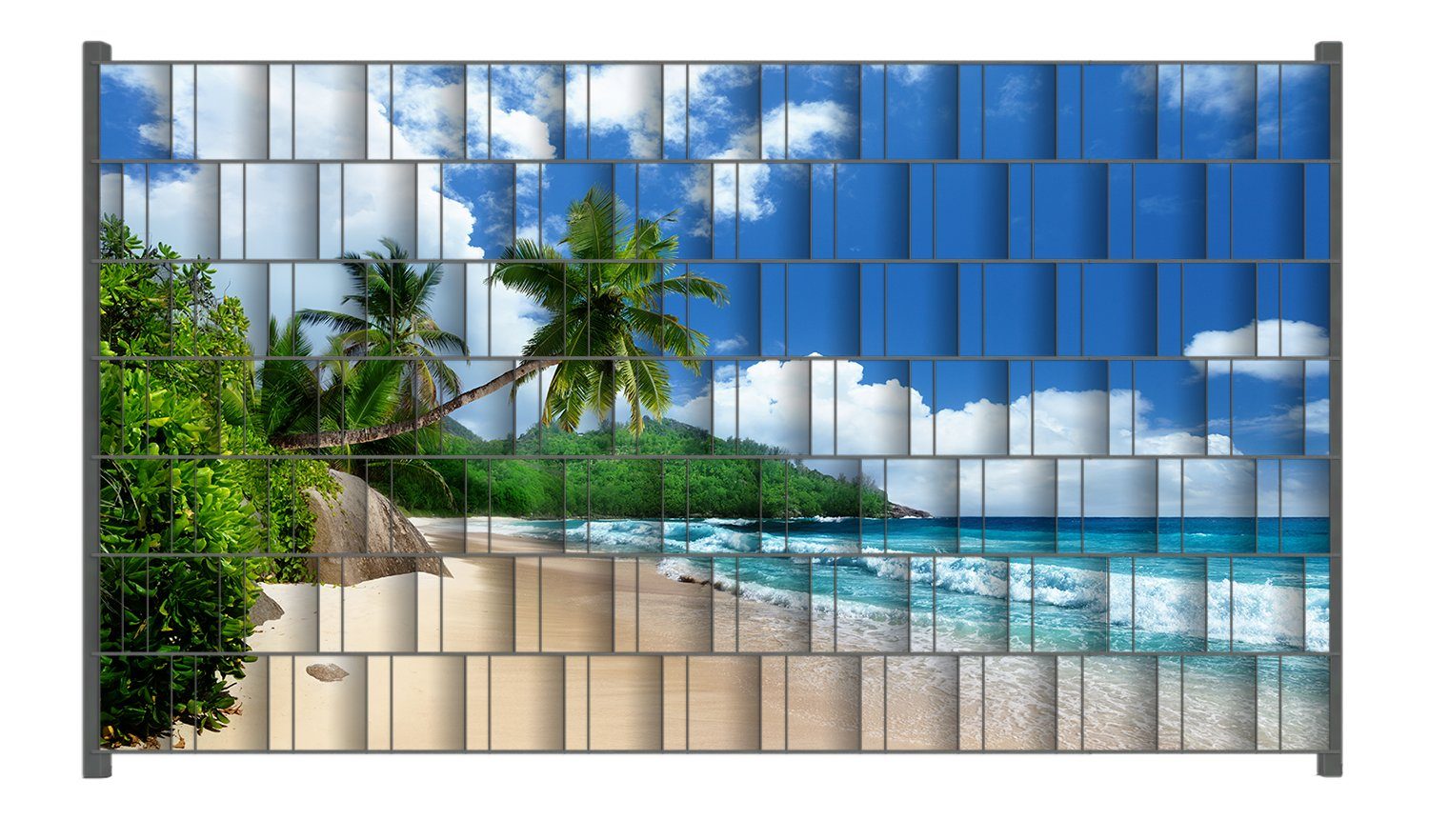 Ausgesuchte Motive unserer Kollektion werden auf blickdichtes Kunststoff-Bannermaterial gedruckt und bereits fertig für Sie zugeschnittenen. Die nummerierten Sichtschutzstreifen können einfach in den Zaun geflochten werden. Werkzeug wird für die Installation nicht benötigt. Die Höhe der einzelnen Bahnen beträgt 19,2 cm, womit diese für alle handelsüblichen Doppelstabmattenzäune geeignet sind. Bei Bedarf können Sie außerdem die Streifen problemlos mit einer Schere auf die von Ihnen benötigte Длина kürzen. Das Material ist wetterfest und für den Außeneinsatz geeignet.