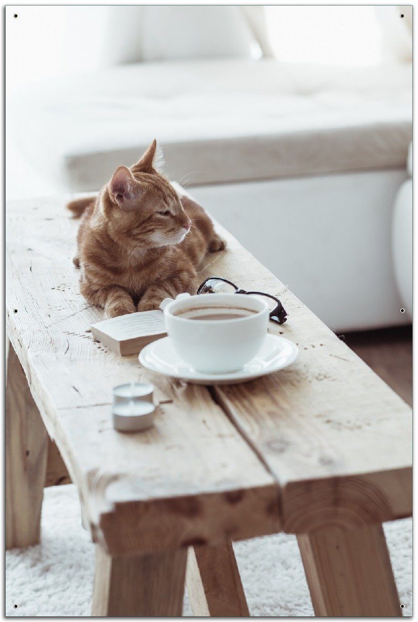 Wallario Sichtschutzzaunmatten Süße rot getigerte Katze beim Kaffee