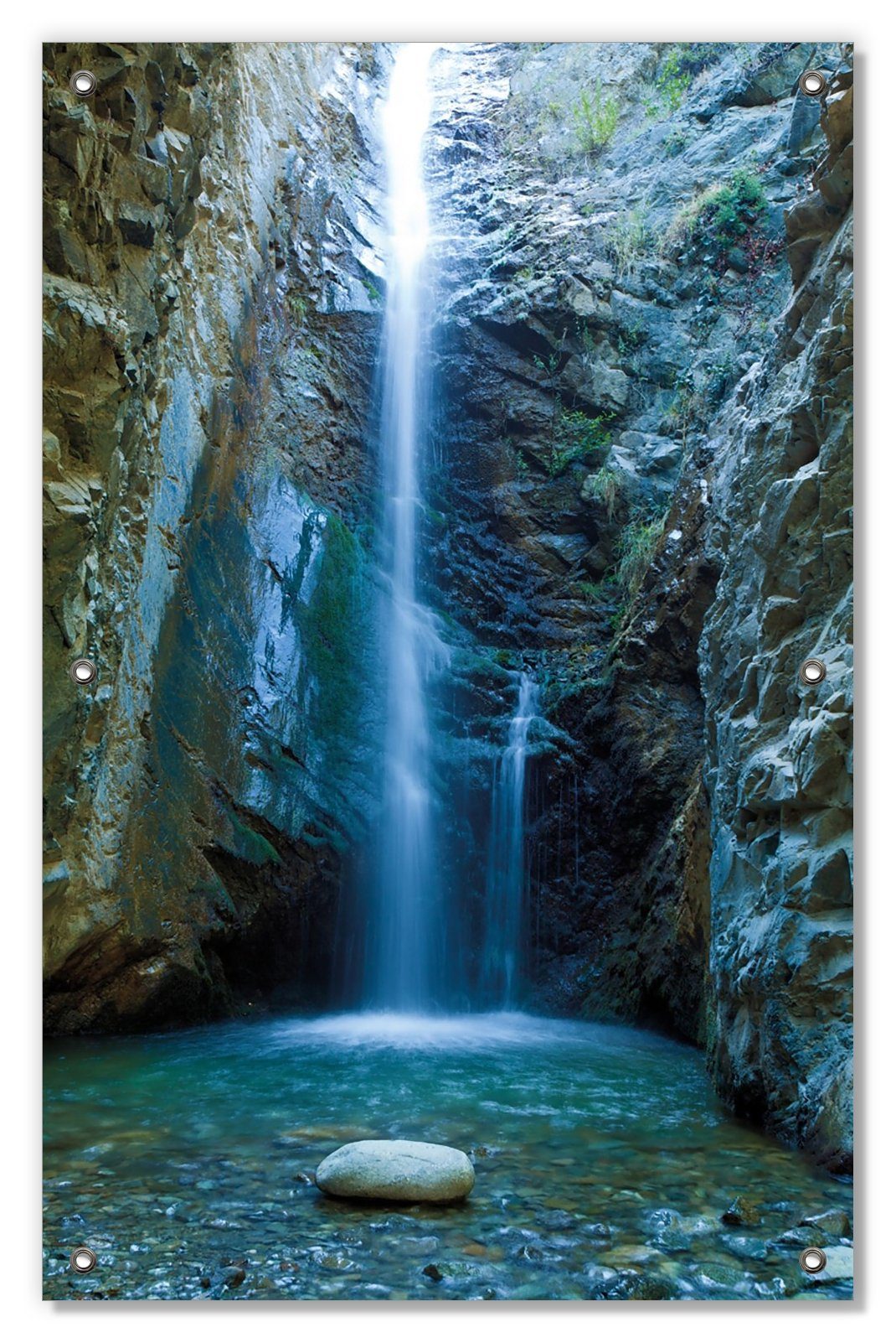 Die Lichtschutzbilder bestehen aus 100 % Polyestergewebe und sind mit stabilen Metallösen versehen. Diese ermöglichen eine denkbar einfache Anbringung: Sie können das Fensterbild mithilfe der mitgelieferten Saugnäpfe direkt auf Ihre Fensterscheibe anbringen und es jederzeit entfernen, ohne Rückstände zu hinterlassen. Eine Seite ist mit einem hochwertigen Motiv aus der Wallario-Kollektion bedruckt, die andere ist in neutralem Weiß gehalten.