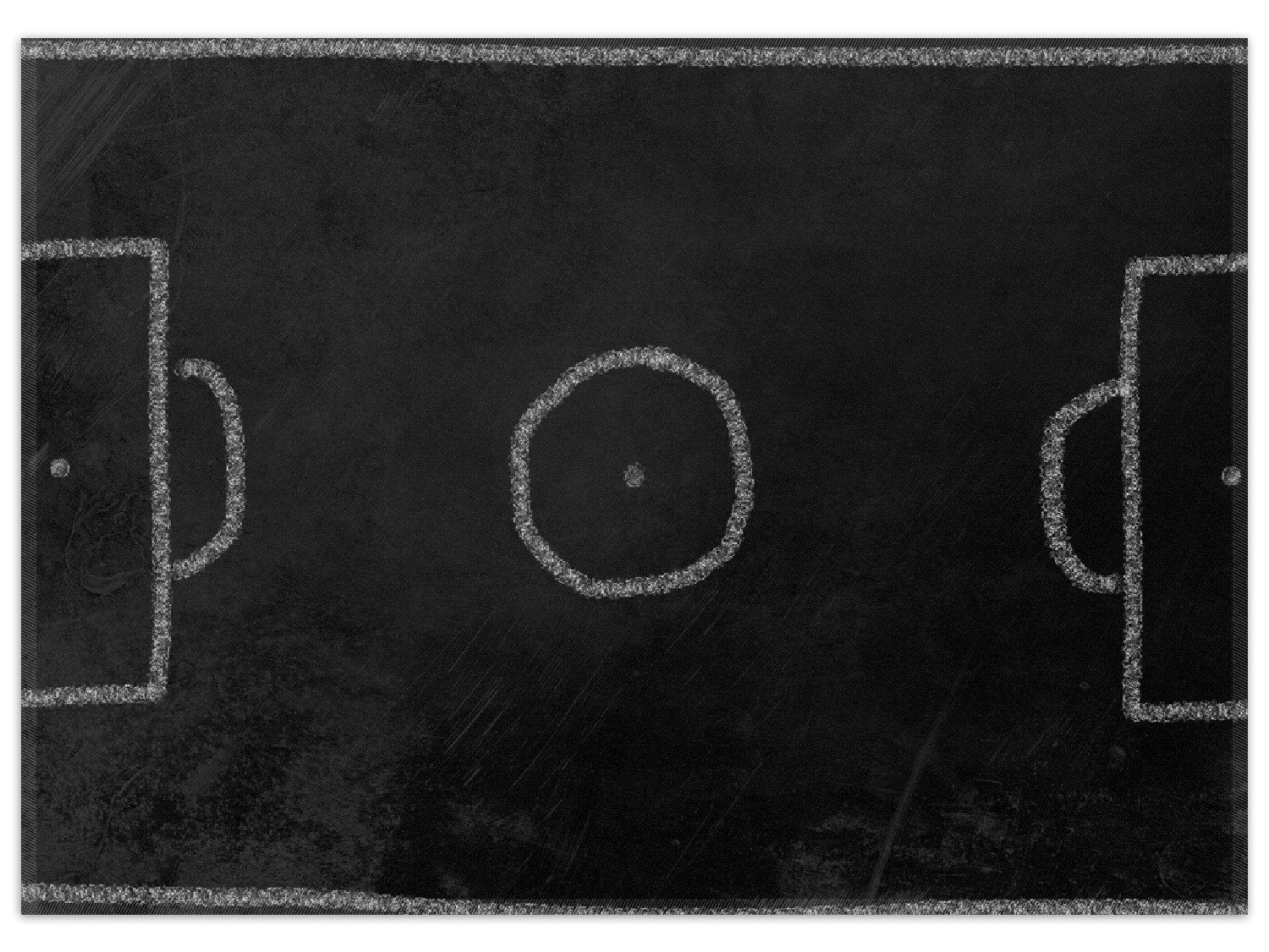 Die Linien eines Fußballfeldes sind mit Kreide auf eine schwarze Schiefertafel gezeichnet.