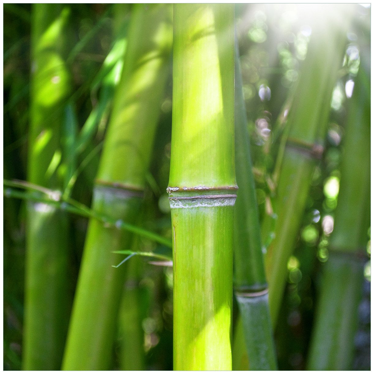 Dicke Bambusrohre ragen in alle Richtungen weit in die Luft. Die helle Sonne scheint durch die Lücken der Bambusstämme und bringt die intensiven Grüntöne zum leuchten.
