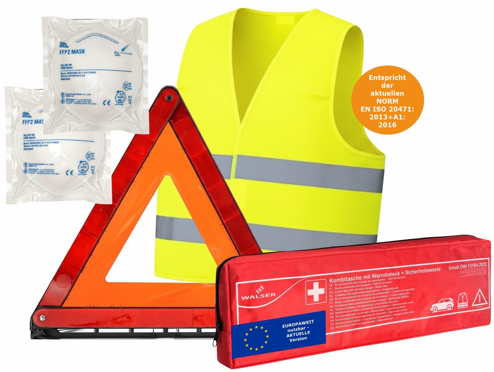 Die Kombitasche beinhaltet neben einem Warndreieck und aktuellem Verbandmaterial zusätzlich zwei FFP2 Masken, eine Warnweste und eine Broschüre mit Erste-Hilfe-Hinweisen.