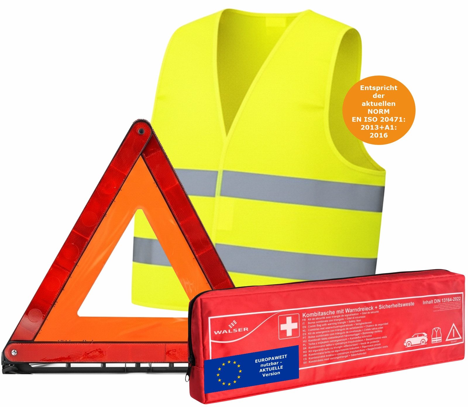 Die Kombitasche beinhaltet neben einem Warndreieck und aktuellem Verbandmaterial zusätzlich eine Warnweste und eine Broschüre mit Erste-Hilfe-Hinweisen.