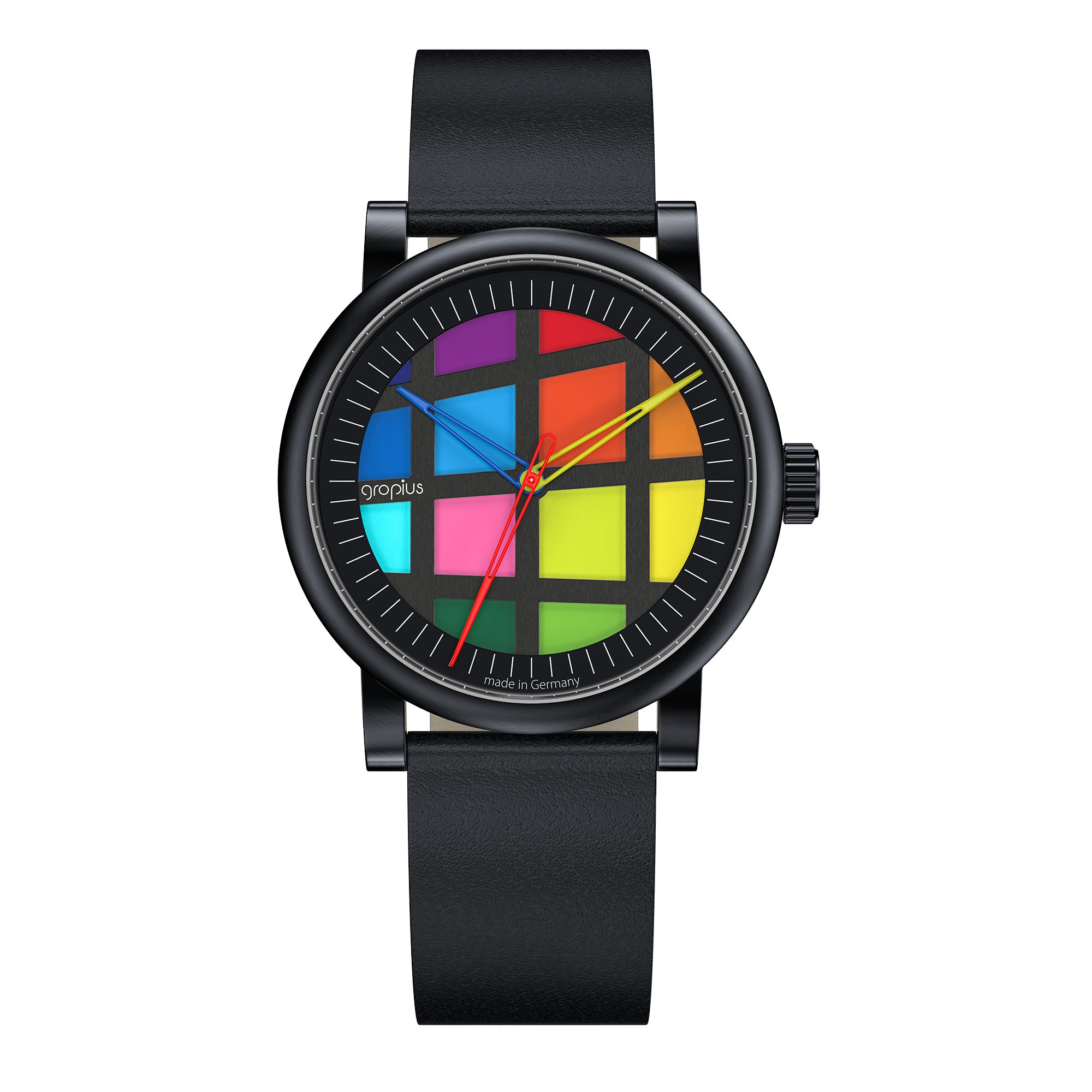 Die Uhren, die im Geiste des Bauhauses entworfen werden, verkörpern dessen Essenz mit ihrem klaren Design und hoher Funktionalität. Diese Zeitmesser sind mehr als bloße Gebrauchsgegenstände; sie sind stilvolle Accessoires, die das Erbe von Gropius und seine Philosophie fortführen. Sie vereinen Ästhetik und Funktionalität in einer Weise, die sowohl Liebhaber des klassischen Bauhaus-Stils als auch moderne Uhrenfreunde anspricht. Das Design der Uhren ahmt nicht den Gestaltungsstil von Gropius nach, sondern interpretiert ihn neu. Bauhaus steht allgemein für zeitloses Design, Einfachheit, vor allem aber auch für das Experimentelle. Das Design der Bauhaus Walter Gropius Uhren macht den neugierigen und spielerischen Aspekt am Bauhaus sichtbar. Poppige Farben, basierend auf den Grundfarben Blau, Gelb und Rot, farbige Zeiger sowie grafische Zifferblätter sind charakteristisch für die Uhrenkollektion.
