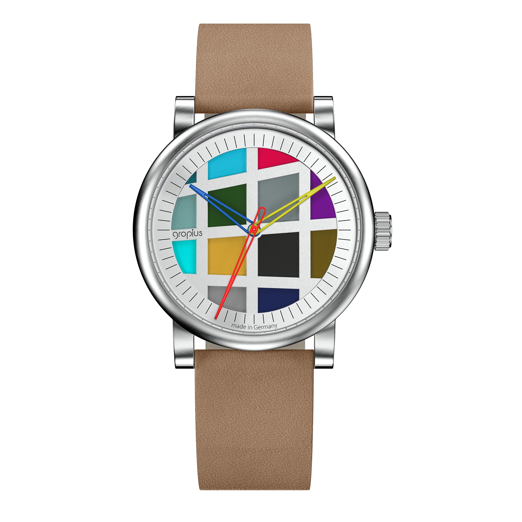 Die Uhren, die im Geiste des Bauhauses entworfen werden, verkörpern dessen Essenz mit ihrem klaren Design und hoher Funktionalität. Diese Zeitmesser sind mehr als bloße Gebrauchsgegenstände; sie sind stilvolle Accessoires, die das Erbe von Gropius und seine Philosophie fortführen. Sie vereinen Ästhetik und Funktionalität in einer Weise, die sowohl Liebhaber des klassischen Bauhaus-Stils als auch moderne Uhrenfreunde anspricht. Das Design der Uhren ahmt nicht den Gestaltungsstil von Gropius nach, sondern interpretiert ihn neu. Bauhaus steht allgemein für zeitloses Design, Einfachheit, vor allem aber auch für das Experimentelle. Das Design der Bauhaus Walter Gropius Uhren macht den neugierigen und spielerischen Aspekt am Bauhaus sichtbar. Poppige Farben, basierend auf den Grundfarben Blau, Gelb und Rot, farbige Zeiger sowie grafische Zifferblätter sind charakteristisch für die Uhrenkollektion.