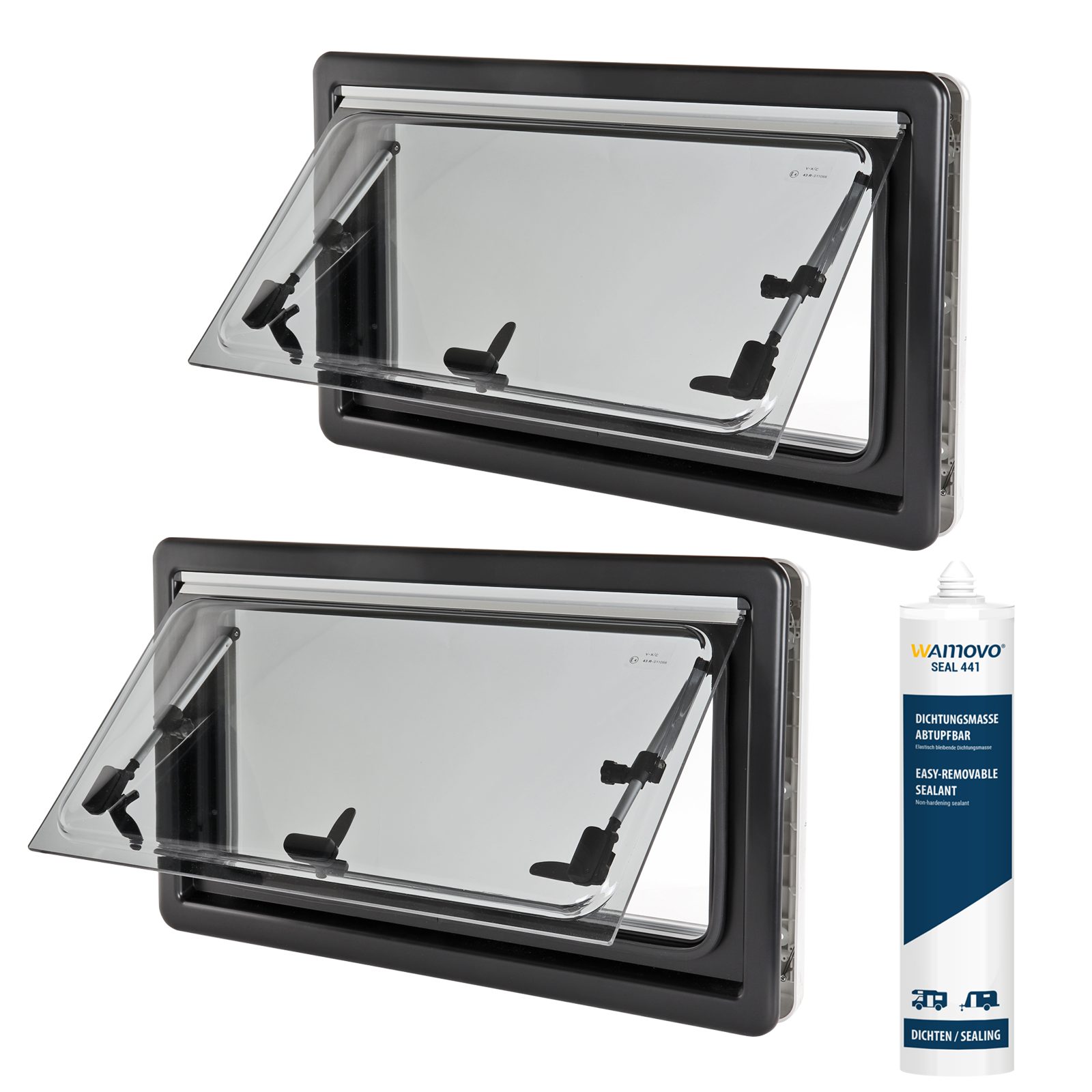 Lieferumfang | 2x Ausstellfenster 90x45 mit Fliegengitter, Rollo, Dichtmittel |