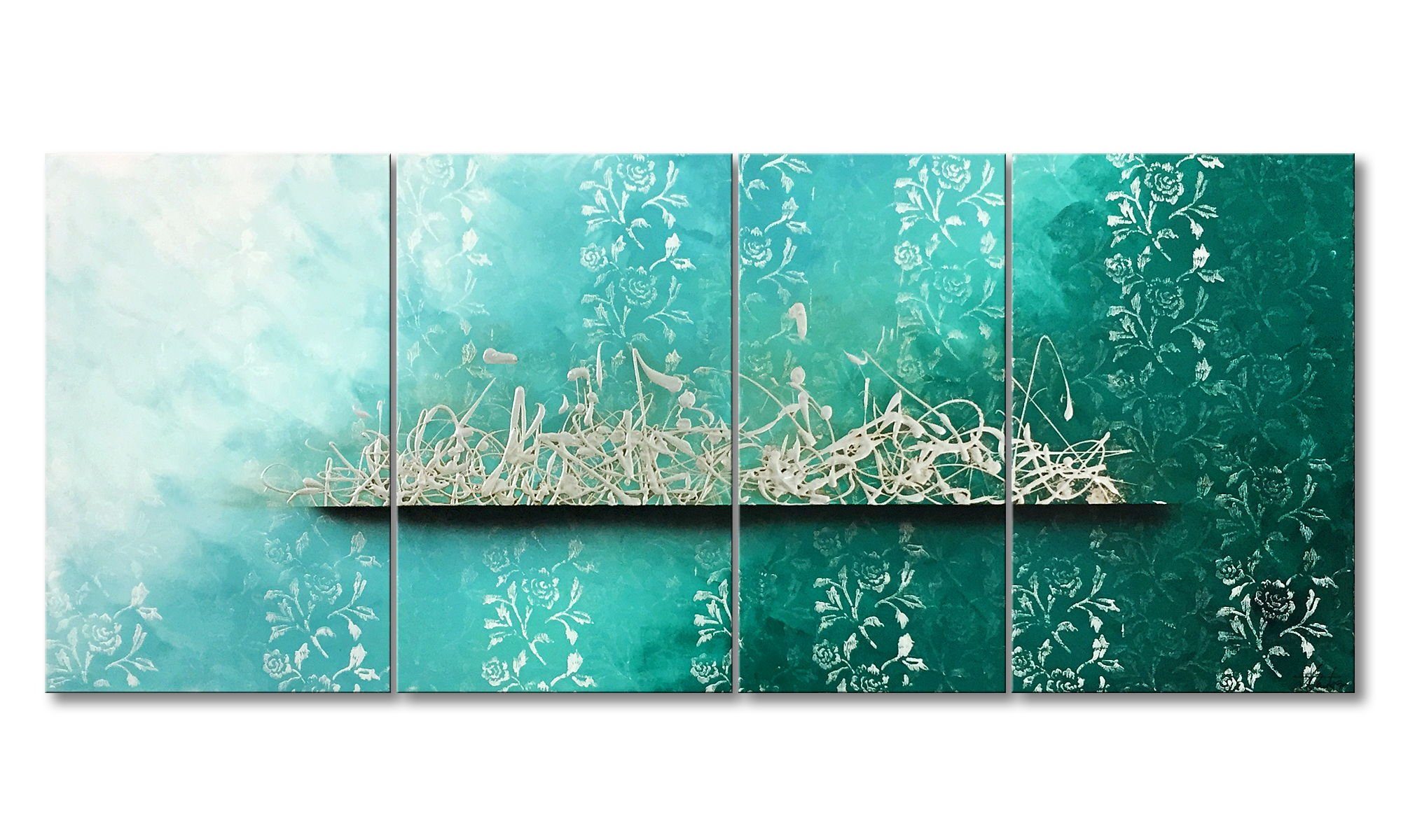 • In diesem Wandbild werden unter anderem die Farben Türkis, Grün und Silber verwendet