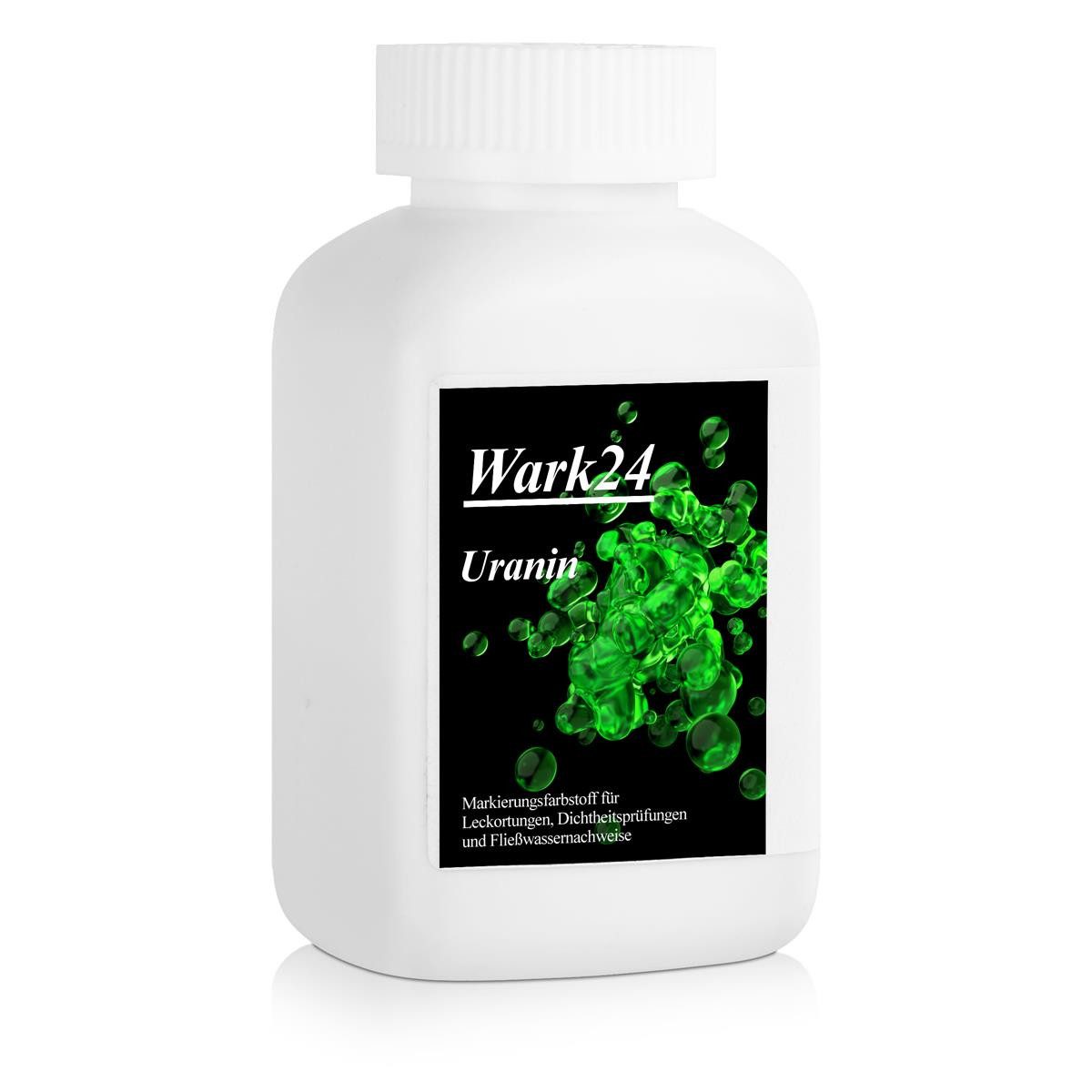 Wark24 Uranin: AnwendungshinweiseDas rote Pulver unseres Wark24 Uranins wird in hochgradiger Verdünnung angewendet, da erst dann die fluoreszierende Wirkung einsetzt. Selbst kleinste Undichtigkeiten können im Anschluss mittels einer UV-Lampe entdeckt werden. Je nach Wassertrübung wird eine Dosierung von 1 bis 20 Gramm Uranin pro 1.000 Liter Wasser empfohlen. Die genaue Farbgebung hängt von der Konzentration ab und kann von Tiefgrün bis zu einem hellen Gelbgrün reichen.