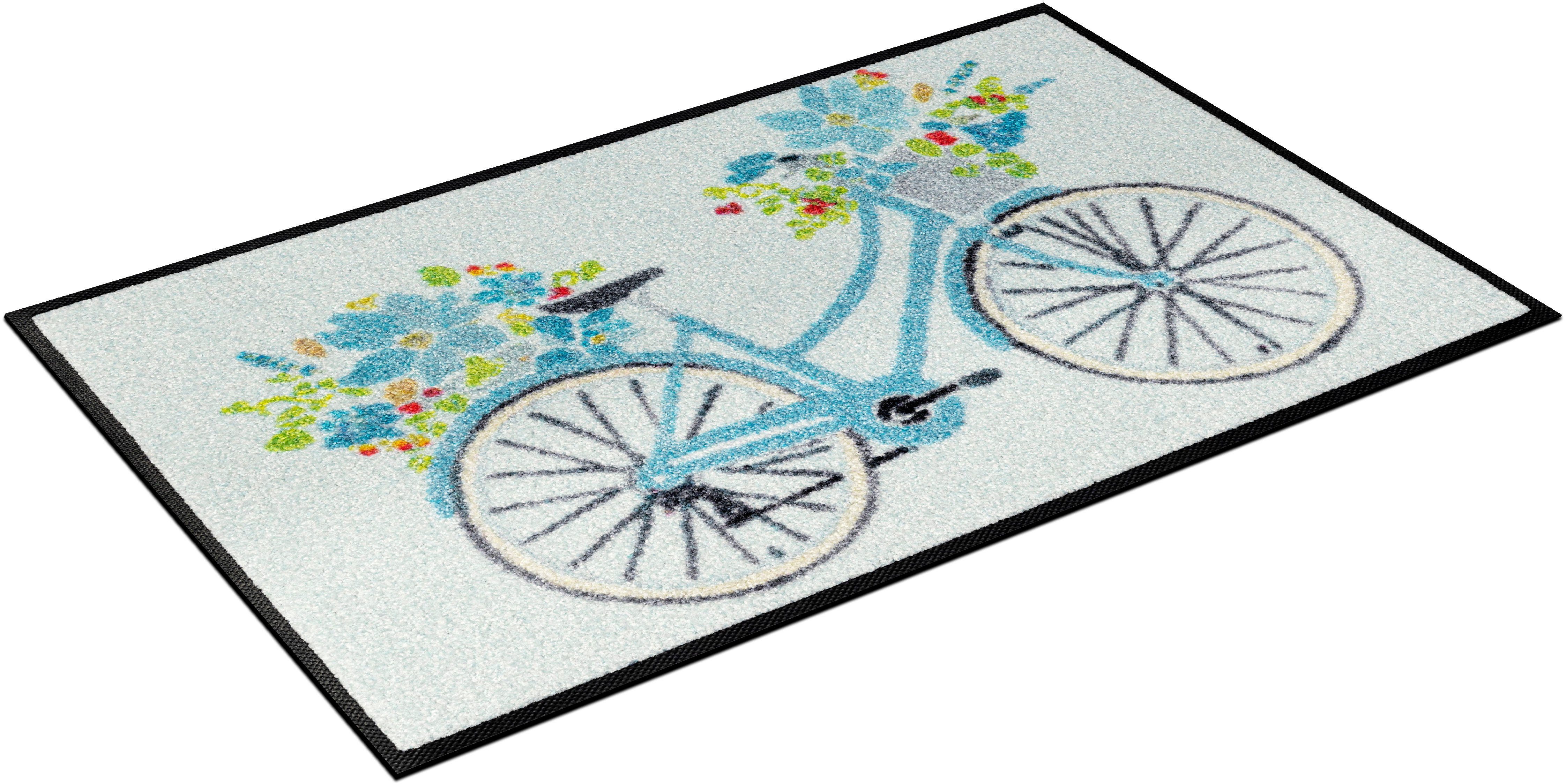 Das wash+dry Design Daisy Dasiy in der Размер 50/75cm ist von der englischen Malerin Julie Dodsworth. Inspiriert vom englischen Landleben und dem Cottage Style zeigt es ein blumengeschmücktes Fahrrad in blau. Besonders schön passt die Daisy Daisy im Übergang von Drinnen nach Draußen zum Garten oder zur Terrasse. Ein paar bunte Farbakzente lassen sie fröhlich und heiter wirken, ohne zu bunt zu sein. Individuell einsetzbar als klassische Fußmatte vor dem Eingang, als Eyecatcher in Flur oder Garderobe, aber auch auf Balkonen, Terrassen und in Wintergärten sind die ?wash+dry?-Matten ein optisches Highlight und nützlicher Helfer zugleich. Neben dem dekorativen Aspekt kommt bei allen wash+dry Matten die Funktion nicht zu kurz. Zuverlässig nimmt der flache, dichte Flor aus Polyamid Schmutz und Feuchtigkeit auch in hoch frequentierten Bereichen auf. Die rutschhemmende Rückenbeschichtung aus Nitrilgummi sorgt für sicheren Stand. Aufgrund von Farbechtheit und Formstabilität kann die Matte einfach in der Waschmaschine und auch im Trockner gereinigt werden, um die jahrelange Freude an der Matte zu gewährleisten. Für die tägliche Reinigung ist der Teppich leicht zu saugen und auch für den Saugroboter geeignet, da der Flor sehr flach ist. Der Teppich ist 100% PVC-frei.