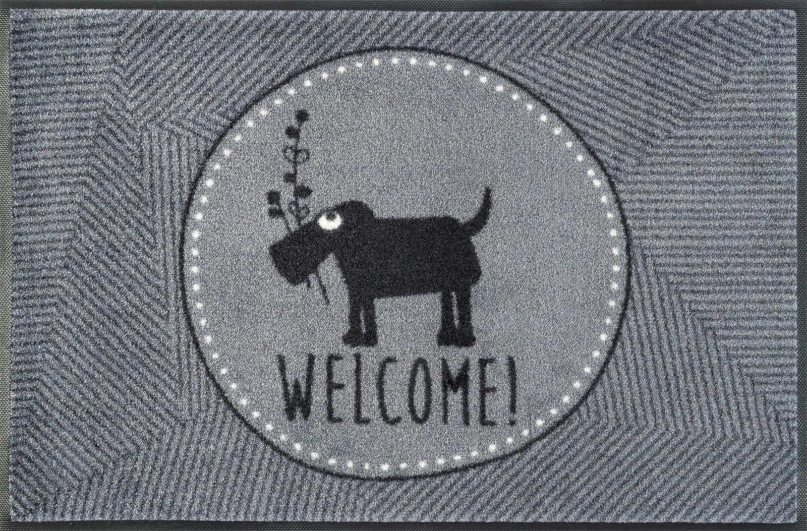 Mattengeschichten mit Hund‘ und Katz‘. Mit dem Mattenmotiv „Herr Just“ aus der wash+dry by Kleen-Tex Lizenzkollektion des Labels „cats on appletrees“ sichern Sie sich eine Fußmatte der besonderen Art für Ihr Zuhause. Frisch und fröhlich begrüßt die witzige Meute rund um Katze Friedegunde Ihre Gaste und lädt ein zum Fröhlichsein. Neben dem dekorativen Aspekt kommt bei allen wash+dry Matten und Läufern die Funktion nicht zu kurz. Zuverlässig nimmt der flache, dichte Flor aus Polyamid Schmutz und Feuchtigkeit auch in hoch frequentierten Bereichen auf. Die rutschhemmende Rückenbeschichtung aus Nitrilgummi sorgt für sicheren Stand. Aufgrund von Farbechtheit und Formstabilität kann die Matte einfach in der Waschmaschine und auch im Trockner gereinigt werden, um die jahrelange Freude an der Matte zu gewährleisten. Der Teppich ist 100% PVC-frei.
