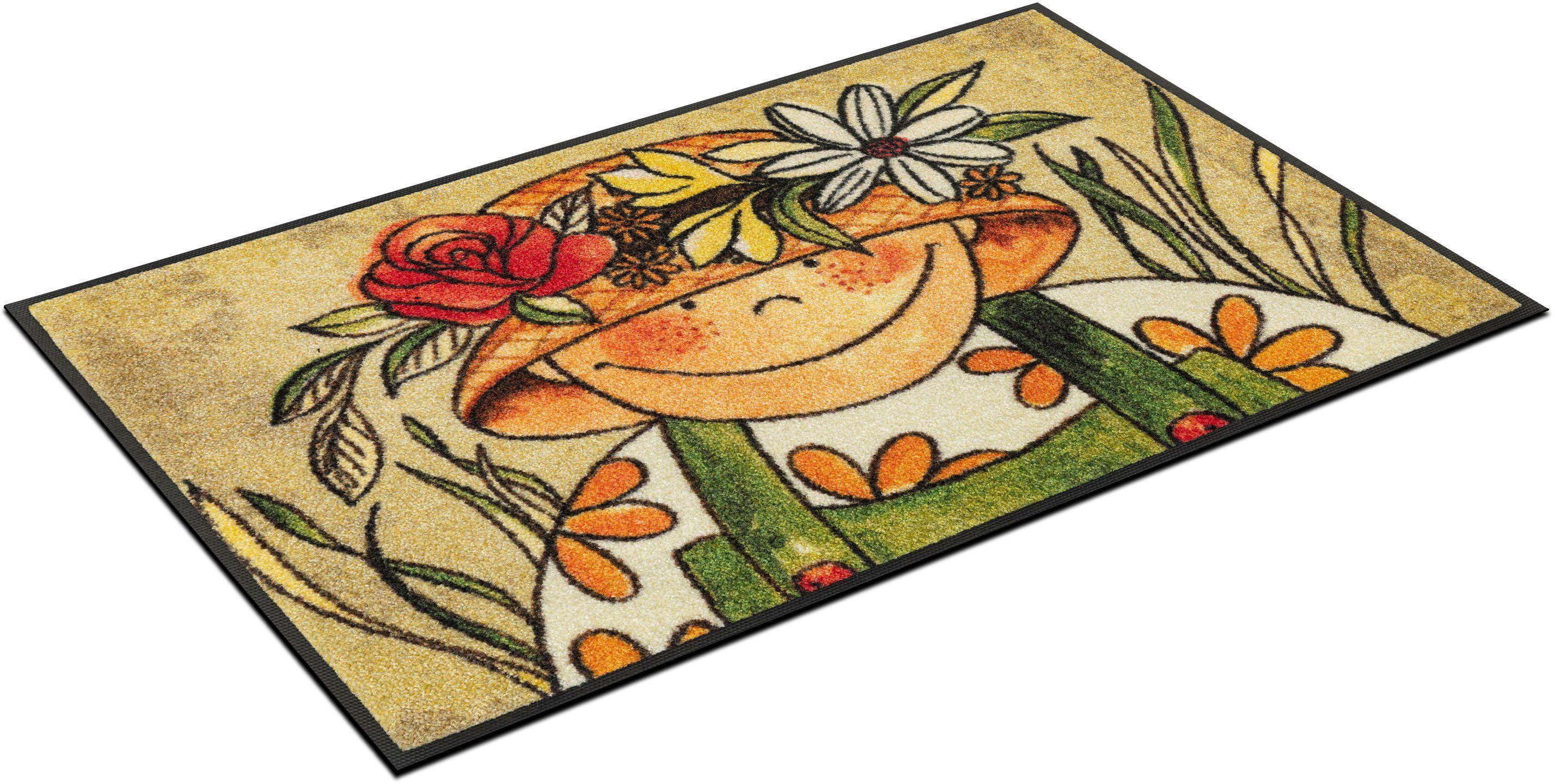 Ein fröhliches Gesicht für Ihren Boden. Die waschbare Fußmatte Johanna von wash+dry by Kleen-Tex ist eine farbenfrohe und einzigartige Interpretation des Gartenthemas. Mit ihren lebhaften Farben und einem strahlenden Gesicht wird die Matte zu einem unvergesslichen Blickfang in Ihrem Zuhause. Sie ist eine einzigartige Kombination aus künstlerischer Vielfalt und Funktionalität. Individuell einsetzbar als klassische Fußmatte vor dem Eingang, als Eyecatcher in Flur oder Garderobe, aber auch auf Balkonen, Terrassen und in Wintergärten sind die „wash+dry“-Matten immer ein optisches Highlight und nützlicher Helfer zugleich. Neben dem dekorativen Aspekt kommt bei allen wash+dry Matten die Funktion nicht zu kurz. Zuverlässig nimmt der flache, dichte Flor aus Polyamid Schmutz und Feuchtigkeit auch in hoch frequentierten Bereichen auf. Die rutschhemmende Rückenbeschichtung aus Nitrilgummi sorgt für sicheren Stand. Aufgrund der Farbechtheit und Formstabilität kann die Matte einfach in der Waschmaschine (bei maximal 60 Grad) und auch im Trockner (Programm: Mischgewebe) gereinigt werden, um die jahrelange Freude an der Matte zu gewährleisten. Pflegen Sie so Ihre wash+dry Fußmatte 3 bis 4 Mal im Jahr (bei starker Belastung auch häufiger). Für die tägliche Reinigung ist der Teppich leicht zu saugen und auch für den Saugroboter geeignet, da der Flor sehr flach ist. Die Fußmatte ist 100% PVC-frei. Bei PVC-Böden, Linoleum- und Holzböden kann es durch eine Wechselwirkung mit gummibeschichteten Matten zu einer Farbveränderung der Oberfläche kommen. Für alle Produkte behalten wir uns eine produktionsbedingte Toleranz in der Размер von +/- 3% vor. Farbabweichungen können auftreten.
