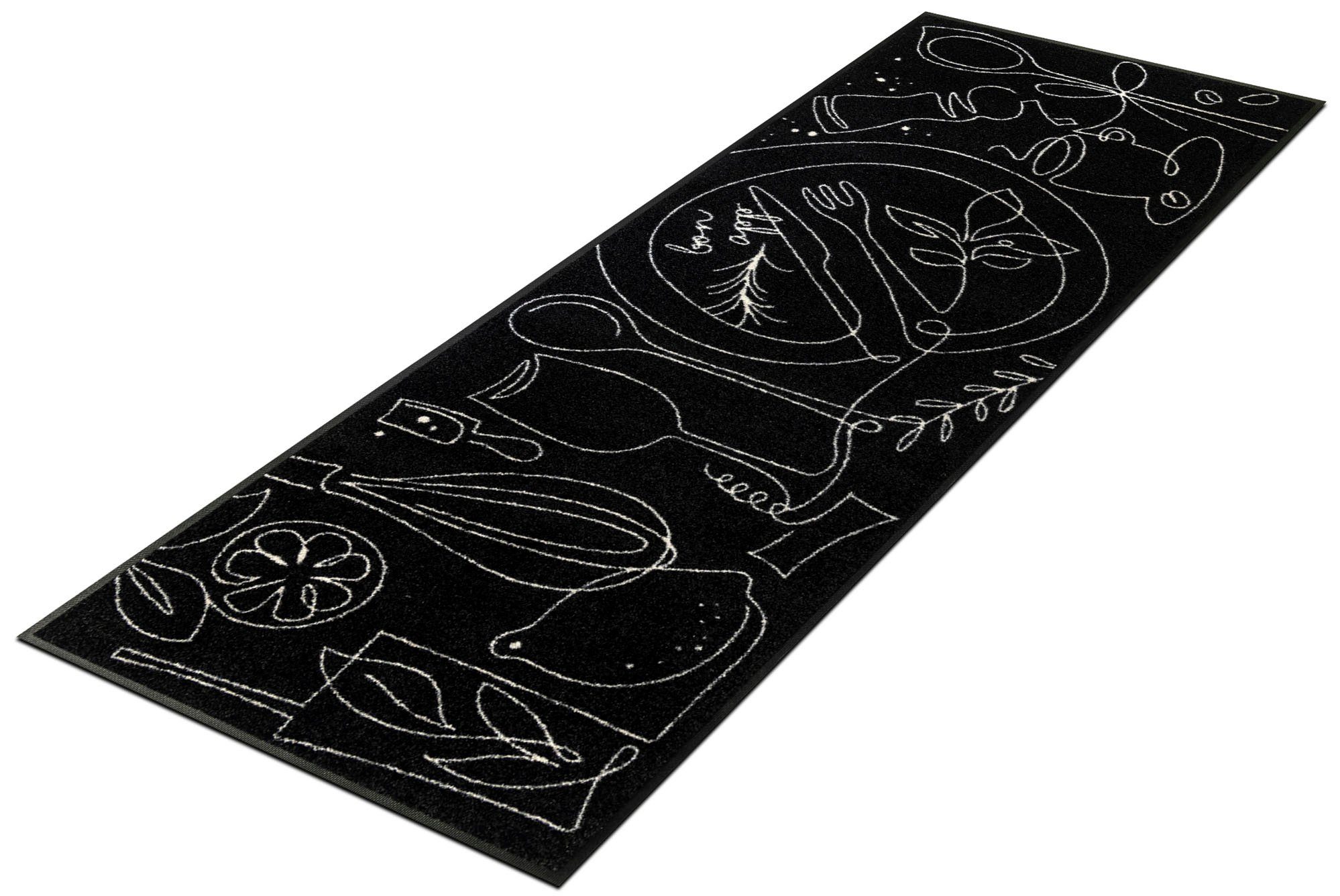 Mit zarten hellen Linien auf schwarzem Hintergrund begegnet Ihnen der Küchenläufer Fine Dining. Abgebildet sind One-Line-Art-Bilder von verschiedenen Küchenutensilien, wie Teller, Gläser und Küchenhelfern. Das moderne schlichte Design kann mit vielen Farben kombiniert werden und ist ein Blickfang in jeder Küche. Neben dem dekorativen Aspekt kommt bei allen wash+dry Matten und Läufern die Funktion nicht zu kurz. Zuverlässig nimmt der flache, dichte Flor aus Polyamid Schmutz und Feuchtigkeit auch in hoch frequentierten Bereichen auf. Für die tägliche Reinigung ist der Teppich leicht zu saugen und auch für den Saugroboter geeignet, da der Flor flach ist. Die rutschhemmende Rückenbeschichtung aus Nitrilgummi sorgt für sicheren Stand. Aufgrund von Farbechtheit und Formstabilität kann die Bodenmatte einfach bei 60 Grad in der Waschmaschine gewaschen werde, beachten Sie dabei bitte die Höchstlast Ihrer Waschmaschine! Den Teppich anschließend flach zum Trocknen auslegen! Der Sauberlaufteppich ist 100% PVC-frei. Bei PVC-Böden, Linoleum Böden und frisch geölten Parkett Böden kann es durch eine Wechselwirkung mit gummibeschichteten Matten zu einer Farbveränderung der Oberfläche kommen. Für alle Produkte behalten wir uns eine produktionsbedingte Toleranz in der Размер von +/- 3% vor. Farbabweichungen können auftreten. Fine Dining gibt es in der Размер 60/180cm.