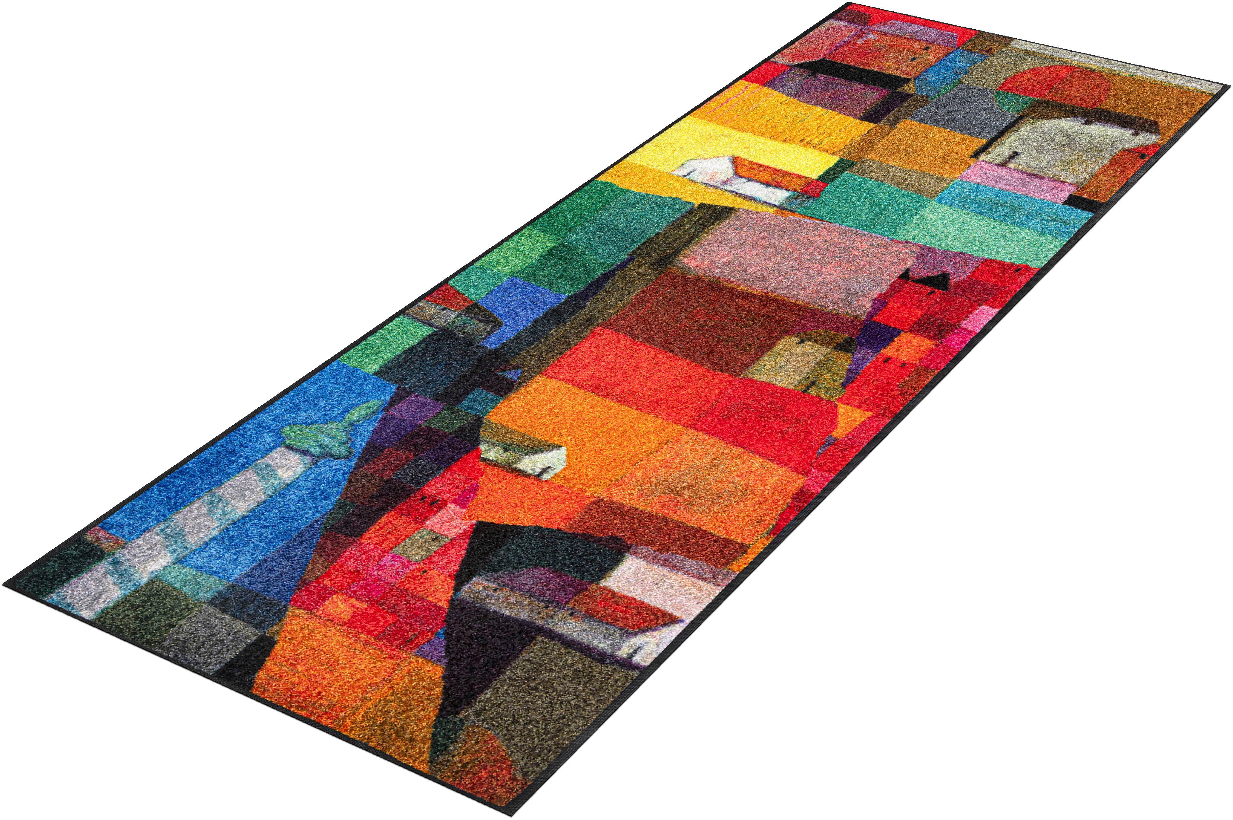 Bodenkunst für Zuhause. Die waschbare Fußmatte „Venetien“ von wash+dry by Kleen-Tex macht sich mit der Malkunst von Eugen Stross zum Blickfang in jedem Zuhause. Die wunderschöne Bildkomposition glänzt durch eine stimmungsvolle und kräftige Farbpalette und bringt ein malerisches Kunstwerk auf Ihren Boden. Individuell einsetzbar als klassische Fußmatte vor dem Eingang, als Eyecatcher in Flur oder Garderobe, aber auch auf Balkonen, Terrassen und in Wintergärten sind die „wash+dry“-Matten immer ein optisches Highlight und nützlicher Helfer zugleich. Neben dem dekorativen Aspekt kommt bei allen wash+dry Matten die Funktion nicht zu kurz. Zuverlässig nimmt der flache, dichte Flor aus Polyamid Schmutz und Feuchtigkeit auch in hoch frequentierten Bereichen auf. Die rutschhemmende Rückenbeschichtung aus Nitrilgummi sorgt für sicheren Stand. Aufgrund der Farbechtheit und Formstabilität kann die Matte einfach in der Waschmaschine (bei maximal 60 Grad) und auch im Trockner (Programm: Mischgewebe) gereinigt werden, um die jahrelange Freude an der Matte zu gewährleisten. Pflegen Sie so Ihre wash+dry Fußmatte 3 bis 4 Mal im Jahr (bei starker Belastung auch häufiger). Für die tägliche Reinigung ist der Teppich leicht zu saugen und auch für den Saugroboter geeignet, da der Flor sehr flach ist. Die Fußmatte ist 100% PVC-frei. Bei PVC-Böden, Linoleum Böden und frisch geölten Holzböden kann es durch eine Wechselwirkung mit gummibeschichteten Matten zu einer Farbveränderung der Oberfläche kommen. Für alle Produkte behalten wir uns eine produktionsbedingte Toleranz in der Размер von +/- 3% vor. Farbabweichungen können auftreten. Die Designserie „Venetien“ gibt es in fünf Größen 40/60 cm, 50/75 cm, 75/120 cm, 115/175 cm und als Läufer in 60/180 cm.