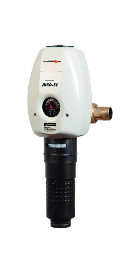 Judo Juko Hauswasserstation mit Judo Express Connection 11/4", Juko Ec, mit einem Gehäuse aus hochwertigem Kunststoff PN 16, einem Einbau Drehflansch mit patentiertem Bajonettverschluss aus Messing. Mit einem großen Handrad löst man die Rückspülung aus, bei gleichzeitiger Reinigung des Schauglases (mit vershiebbarer UV Filterglockenabdeckung). Mit integriertem Auslauf und Keramik Spülventil mit Schlauchverschluss, Druckmanometer und Druckminderer mit werksseitiger Nachdruckeinstellung von 4 bar, Einstellbereich von 1,5 bis 6 bar. Schallschutzgeprüft in Gruppe 1 ohne Auflagen, nach DIN EN 13443-1, DIN 19628 und DIN EN 1567 für Wasser bis 30 Grad Celsius. Abdeckhaube mit integrierter Rückspüldatumsanzeige. Einbaulänge 230 mm. - mit Verschraubung - Filtergewebe aus Edelstahl - Handrad zur Rückspülung - Druckmanometer - Drickminderer - Rückspüldatumsanzeige