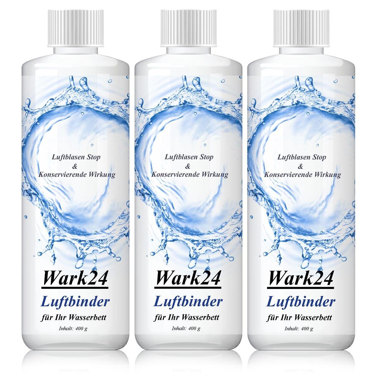 Wark24 Luftbinder Bubble Stop für geräuschlosen Schlaf im Wasserbett!Der Wark24 Luftbinder Bubble Stop ist die ideale Lösung, um Luftblasen im Wasserbett effektiv zu beseitigen. Vor der Anwendung einfach kräftig schütteln, damit sich die Wirkstoffe optimal im Wasserbettkern verteilen. Dann den Wark24 Luftbinder Bubble Stop in den Einfüllstutzen füllen und einige Zeit warten bis sich dieser Entfernen Sie nun;alle Textilien vom Bett und ziehen Sie;den Einfüllstutzen heraus. Drücken Sie;die Luft langsam Richtung Ventil oder verwenden Sie eine Entlüftungspumpe gemäß den Anweisungen des Herstellers. Mit dem Wark24 Luftbinder Bubble Stop genießt du wieder einen ruhigen und erholsamen Schlaf ohne störende Luftblasen im Wasserbett!