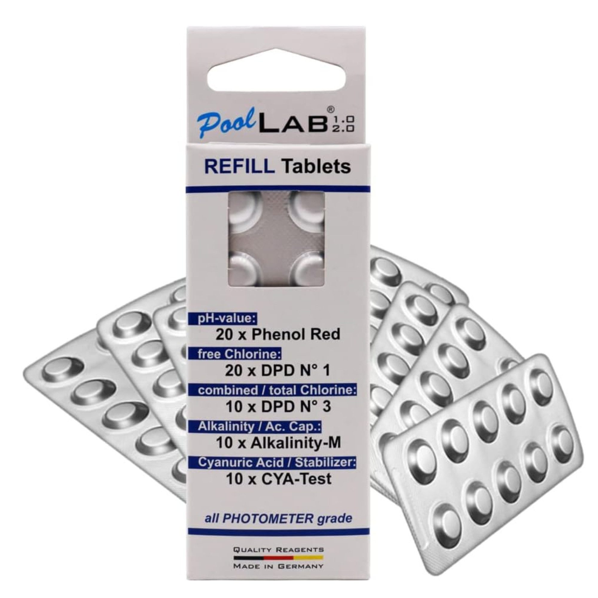 Messparameter | DPD N°1 (freies Chlor) DPD N° 3 (Gesamt Chlor) Phenol Red (pH) Alka-M (Alkalinität) CYA-Test (Cyanursäure) |