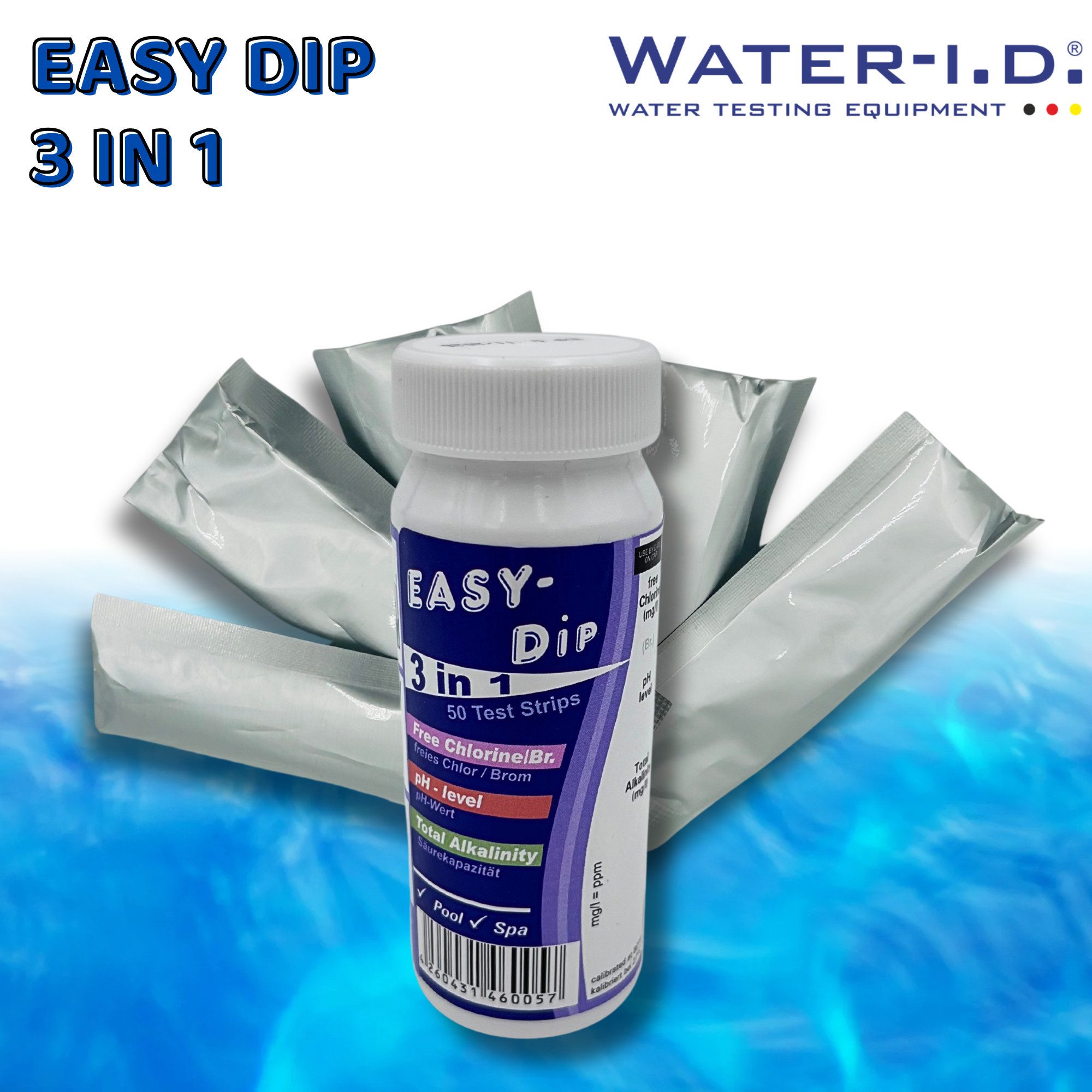 EASY DIP 50 Teststreifen von Water I.D. Chlor pH Alkalinität 50 Teststrips zur Wasseranalyse in Pool, Schwimmbad, Whirlpool, Teich oder Aquarium Prüfung der wichtigsten Parameter der Schwimmbadwasserpflege pH-Wert (pH) - Messbereich 6.8 - 8.2 Chlor (frei) (Cl2 mg/l) - Messbereich 0.0 - 5.0 Brom (Br mg/l) - Messbereich 0 - 11 Alkalinität (gesamt) (CaCO3 mg/l) - Messbereich 0 - 240 Lieferumfang 1 Dose = 5 x 10 (50 Stück) eingeschweißte Teststreifen Mit den Pool-i.d. Easy Dip TestStreifen Chlor - Brom - Alkalinität überprüfen Sie in wenigen Sekunden die wichtigsten Parameter der Schwimmbadwasserpflege Die Anwendung ist kinderleicht: Dose öffnen und einen Teststreifen der Aluminium-Verpackung entnehmen Dose anschließend umgehend wieder verschließen Teststreifen horizontal ca. 20 cm und für ca. 5 Sekunden unter Wasser halten Teststreifen wieder horizontal dem Wasser entnehmen und für ca. 10 sec. in dieser Position halten. Teststreifen nicht schütteln Teststreifen an die Vergleichsfelder auf der Dose halten. Gemessenen Wert durch Vergleich mit der auf der Dose abgedruckten Farbe bestimmen.