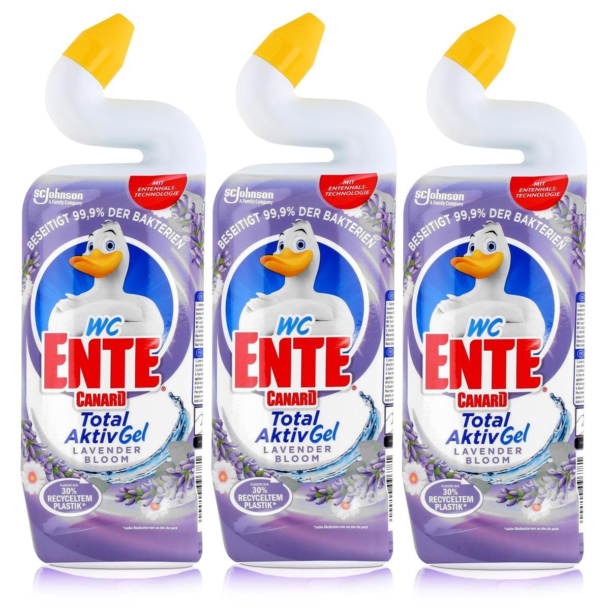 Das WC Ente Total AktivGel Lavender Bloom, 750 ml - Erleben Sie die Kraft des Lavendels Das WC Ente Total AktivGel Lavender Bloom enthält 750 ml der einzigartigen WC Ente Formel, die 99,9 % aller Bakterien abtötet und unangenehme Gerüche beseitigt. Es wurde speziell entwickelt, um Kalk und hartnäckigen Schmutz auch an schwer zugänglichen Stellen zu entfernen, damit Ihre Toilette bei jeder Benutzung hygienisch sauber bleibt. Wirkungsweise: Wie das WC Ente Total AktivGel Lavender Bloom wirkt Das WC Ente Total AktivGel Lavender Bloom hat eine tiefenwirksame Formel, die bis in jeden Winkel Ihrer Toilettenschüssel eindringt. Seine dickflüssige Konsistenz haftet dabei fest an der Oberfläche. Dadurch wird eine maximale Einwirkzeit und eine gründliche Reinigung gewährleistet. Die aktiven Inhaltsstoffe wirken zusammen, um Keime und Bakterien zu beseitigen, während der angenehme Lavendelduft Ihr Badezimmer frisch und sauber duften lässt. Praktische Anwendungshinweise für WC Ente Total AktivGel Lavender Bloom Das WC Ente Total AktivGel Lavender Bloom ist einfach in der Anwendung. Einfach den Toilettensitz anheben und die Flasche zusammendrücken, damit das Gel den Flaschenhals füllt. Halten Sie die Flasche dann direkt unter den Rand der Toilettenschüssel und drücken Sie das Gel gleichmäßig um die Schüssel herum, wobei Sie etwa 60 ml des Produkts verwenden. Lassen Sie das Gel dann 5 Minuten einwirken, bevor Sie die Toilettenschüssel mit einer Toilettenbürste reinigen. Zum Schluss die Toilettenschüssel einfach normal ausspülen. Für ein optimales Ergebnis empfehlen wir das WC Ente Total AktivGel Lavender Bloom mindestens 3-mal pro Woche zu verwenden. So beugen Sie eventuellen Kalkablagerungen vor und halten Ihre Toilette sauber und hygienisch.Inhaltsstoffe | <5% nicht-ionische Tenside, Desinfektionsmittel, Duftstoffe |