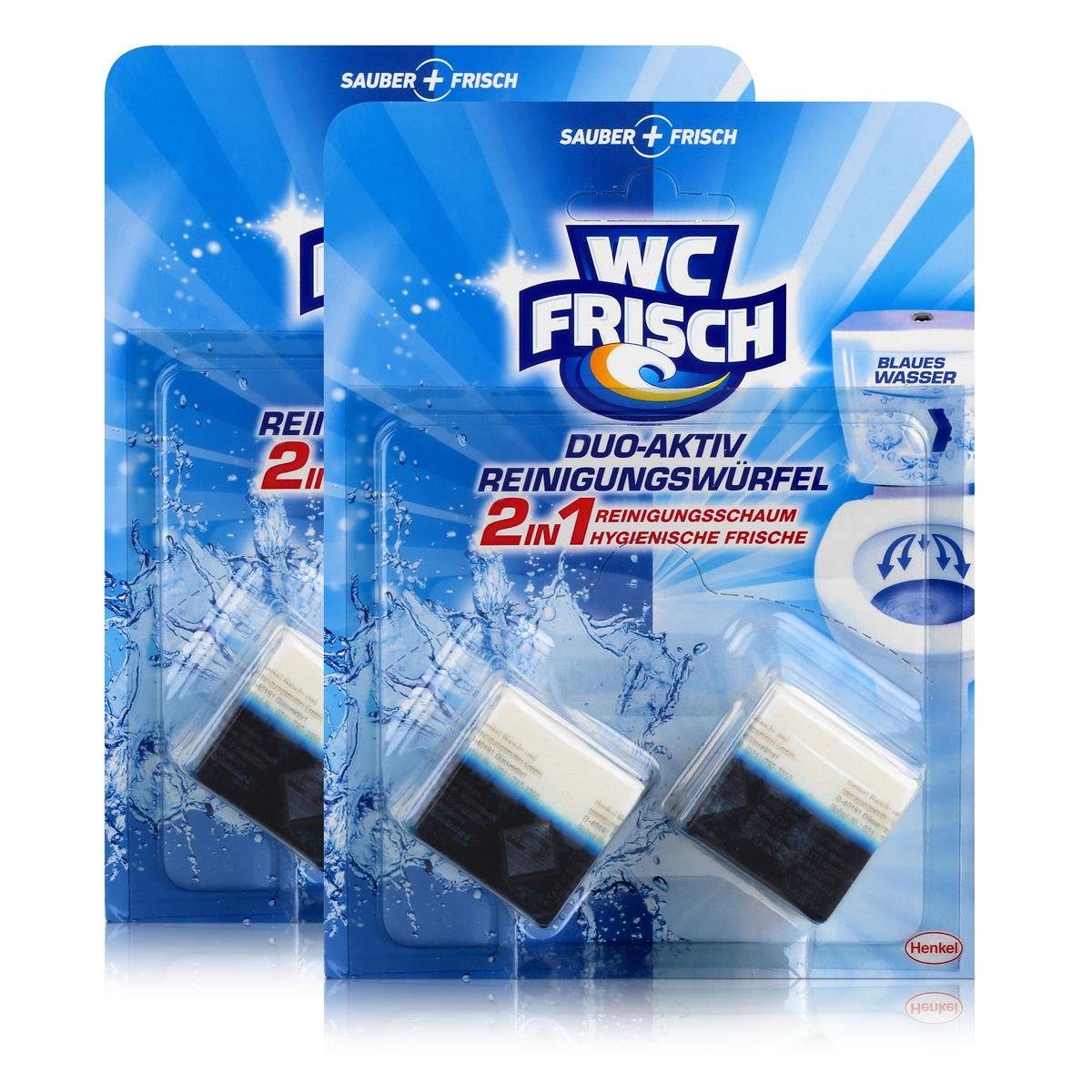 ""> "" ""> "name">Wie wirken die WC Frisch Duo-Aktiv Reinigungswürfel? "" ""> "text">Das Besondere an den WC Frisch Duo-Aktiv Reinigungswürfeln ist die einzigartige Doppelkammer Technologie. Während sich in einer Kammer ein tiefenreinigendes WC-Reinigungsgel befindet, steckt in der anderen Kammer ein angenehm riechendes WC-Duftgel. Somit erzielen die WC Frisch Duo-Aktiv Reinigungswürfel gleich den doppelten Effekt. Sie hinterlassen Ihre Toilette nach jeder Spülung nicht nur makellos rein, sondern auch wohlriechend. Während viele herkömmliche Reinigungsmittel Ihre Toilette nur oberflächlich säubern, entfernt das kraftvolle WC-Reinigungsgel in der linken Kammer Schmutz, Kalk und Urinstein wirkungsvoll. Durch den Wirkstoff Zitronensäure, gelingt dies besonders effizient. Anstatt einfach die bestehenden Verschmutzungen zu entfernen, beugt die Zitronensäure zudem zukünftigen Schmutzablagerungen vor und hält so ihr Badezimmer langfristig sauber. Das WC-Duftgel in der rechten Kammer bekämpft unangenehme Gerüche wirkungsvoll und hinterlässt nach jeder Spülung einen angenehm frischen Geruch in Ihrem Badezimmer. "" ""> "name">Wie werden WC Frisch Duo-Aktiv Reinigungswürfel angewendet und verfärben sie das Wasser? "" ""> "text">Die Anwendung der WC Frisch Duo-Aktiv Reinigungskapseln ist genauso einfacInhaltsstoffe | 15-30%: anionische Tenside , 5-15%: nichtionische Tenside |