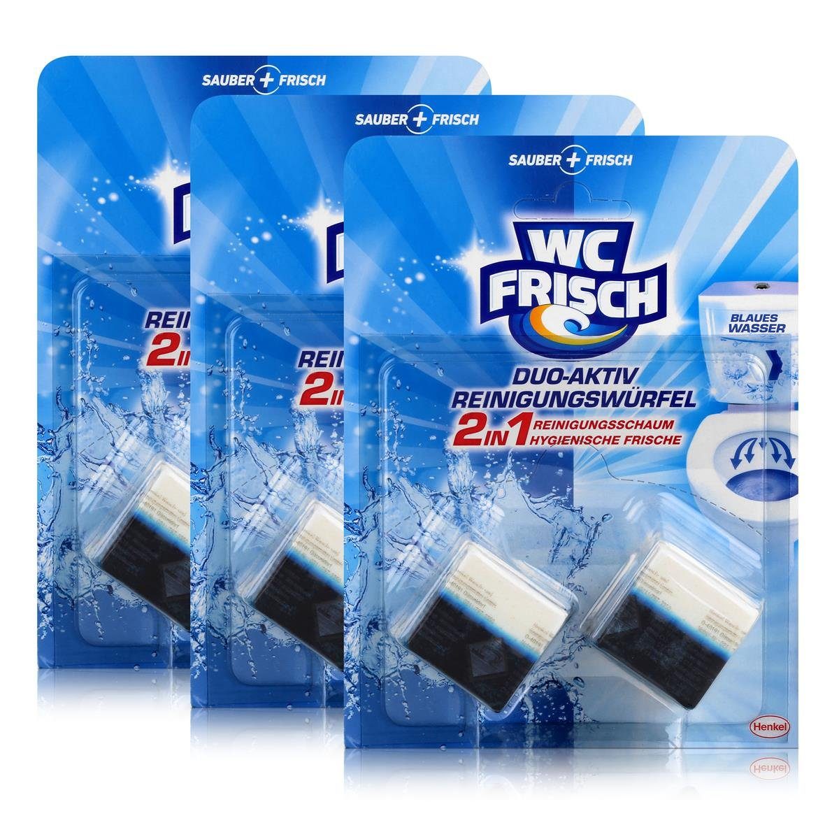 ""> "" ""> "name">Wie wirken die WC Frisch Duo-Aktiv Reinigungswürfel? "" ""> "text">Das Besondere an den WC Frisch Duo-Aktiv Reinigungswürfeln ist die einzigartige Doppelkammer Technologie. Während sich in einer Kammer ein tiefenreinigendes WC-Reinigungsgel befindet, steckt in der anderen Kammer ein angenehm riechendes WC-Duftgel. Somit erzielen die WC Frisch Duo-Aktiv Reinigungswürfel gleich den doppelten Effekt. Sie hinterlassen Ihre Toilette nach jeder Spülung nicht nur makellos rein, sondern auch wohlriechend. Während viele herkömmliche Reinigungsmittel Ihre Toilette nur oberflächlich säubern, entfernt das kraftvolle WC-Reinigungsgel in der linken Kammer Schmutz, Kalk und Urinstein wirkungsvoll. Durch den Wirkstoff Zitronensäure, gelingt dies besonders effizient. Anstatt einfach die bestehenden Verschmutzungen zu entfernen, beugt die Zitronensäure zudem zukünftigen Schmutzablagerungen vor und hält so ihr Badezimmer langfristig sauber. Das WC-Duftgel in der rechten Kammer bekämpft unangenehme Gerüche wirkungsvoll und hinterlässt nach jeder Spülung einen angenehm frischen Geruch in Ihrem Badezimmer. "" ""> "name">Wie werden WC Frisch Duo-Aktiv Reinigungswürfel angewendet und verfärben sie das Wasser? "" ""> "text">Die Anwendung der WC Frisch Duo-Aktiv Reinigungskapseln ist genauso einfacInhaltsstoffe | 15-30%: anionische Tenside , 5-15%: nichtionische Tenside |
