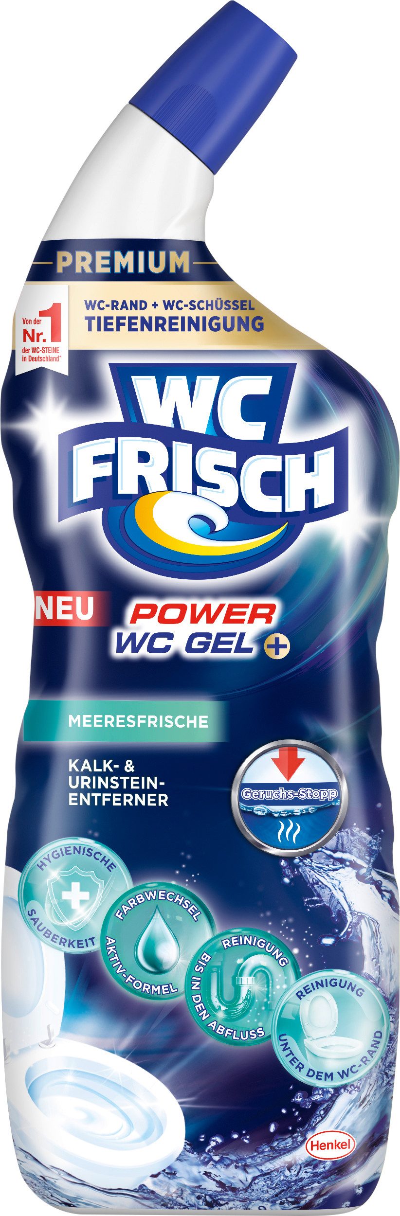 WC FRISCH Power Gel WC Reiniger Meeresfrische – Für Tiefenreinigung bis in den Abfluss & unter dem WC-Rand Das WC FRISCH Power WC Gel Meeresfrische sorgt dank seiner starken Reinigungskraft für hygienische Sauberkeit. Mit der innovativen WC FRISCH 4-fach Kombination bietet der Toilettenreiniger hygienische Sauberkeit, hat eine Farbwechsel-Aktiv-Formel und reinigt bis in den Abfluss sowie unter dem WC-Rand. Durch die Geruchsstopp-Technologie duftet das Badezimmer langanhaltend frisch. Die innovative Flaschenform erlaubt eine einfache Reinigung. Die Produktvorteile im Detail: 4-fach Wirkung Hygienische Sauberkeit Tiefenreinigung bis in den Abfluss & unter dem WC-Rand Kalk- und Urinsteinentferner Geruchsstopp-Technologie Innovative Flaschenform Anwendung Die praktische Flaschenform sorgt für eine effiziente Reinigung bis unter den WC-Rand.- Einfach unter dem Rand der Toilette auftragen, einwirken lassen, nachbürsten – fertig!- Vorher und nachher durch Drücken und Drehen den kindersicheren Verschluss des WC FRISCH Power WC Gels öffnen und wieder hörbar sicher verschließen.- Zur gründlichen Beseitigung von starken Verschmutzungen 10 Minuten einwirken lassen, etwaige Rückstände mit der Bürste entfernen und spülen.- Nur im WC-Becken verwenden. Spritzer auf dem WC-Sitz, Boden oder säureempfindlichen Oberflächen sofort mit viel klarem Wasser gründlich entfernen, da es sonst zu Schäden oder Verfärbungen kommen kann. Nicht mit Bleichmittel oder anderen Reinigungsmitteln mischen, dies kann zur Bildung von giftigen Chlorgasen oder Hitzeentwicklung führen. Die Marke WC FRISCH WC FRISCH, der Experte für Toilettenreinigung, bietet viele Lösungen, um Ihnen das Leben im Bereich Sauberkeit und Frische in Ihrer Toilette zu erleichtern. Seit der Markteinführung des ersten WC-Steins im Jahre 1968 hat WC FRISCH nie aufgehört, den Markt der Toilettenreiniger und -erfrischer zu revolutionieren.