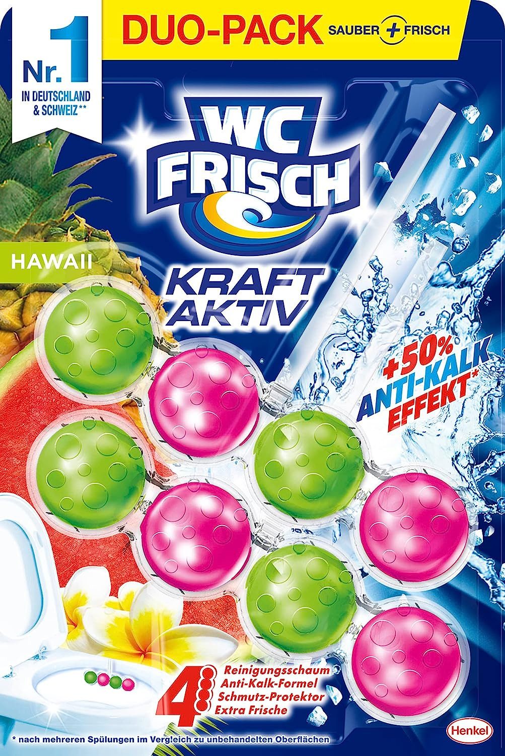 Der WC FRISCH Kraft Aktiv Duftspüler Hawaii sorgt dank +50 % Anti Kalk Effekt* für eine noch intensivere Reinigung bei jeder Spülung. Mit der innovativen WC FRISCH 4-fach Aktivstoff-Kombination sorgt das WC Gel für eine effektive Reinigung dank Reinigungsschaum, Anti-Kalk-Formel, Schmutz-Protektor und Extra Frische. Dank seines dezenten Designs und seinen tollen Farben passt der WC Duftspüler ideal unter den Toilettenrand. Die Produktvorteile im Detail: 4-fach Aktivstoff-Kombination + 50 % Anti-Kalk Effekt* Reinigungsschaum Schmutz-Protektor Extra Frische Dezentes Design *nach mehreren Spülungen im Vergleich zu unbehandelten Oberflächen Anwendung 1. WC Duftstein an den Rand der Toilettenschüssel hängen. 2. Toilettenstein dem Wasserfluss anpassen und Sauberkeit sowie einen intensiven Toilettenduft mit jeder Spülung erleben. 3. WC Duftspüler ersetzen, wenn die Kugeln leer sind.